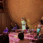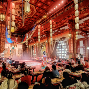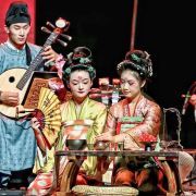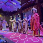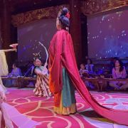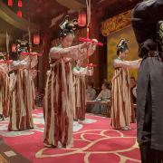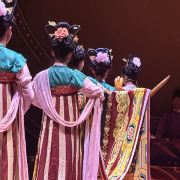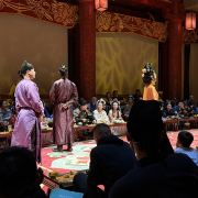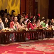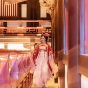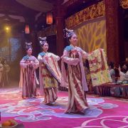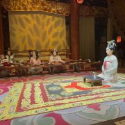 3、《唐宫乐宴》:旺季时最多每天6场,时间分别为10:00、11:15、15:30、16:45、18:00、19:15、20:30。表演是互动式演出,可以沉浸体验当年的诗、乐、茶、礼、服饰、舞蹈等内容,先分4个阵营,即使臣、将士、乐师、画师(主要区别是看表演的座位,其中画师和使臣较好,正对着舞台),每个阵营有20多人,总共2700多套古装可选,由NPC(工作人员)带着队伍去上楼赴宴。