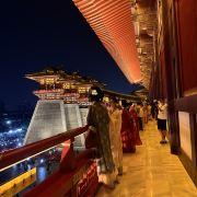 3分 不错性价比一般,有点小贵。提前到应天门,网络购票直接到应天门楼下门口换纸质票,然后进去。可以提前去免费区选古装换上,花点小钱还能弄个妆造,但是衣服比较脏比较丑,建议自己外面租穿来。也可以不换装看演出。然后等待选择角色,我们这轮是朱雀、玄武等四个角色。选好角色,戴上手环,再等待一会儿,大堂里有一场小型演出,结束后凭手环站队,跟着上扶梯,看一段古代的欢迎仪式,但是安排站位不好,矮的人排在队伍后面纵队站根本看不见。看完跟队伍乘电梯。5第一批进电梯能做到第一排的位置。但是第一排的人一上来就要把桌上的小点心吃掉,否则演出开始后,舞蹈演员的裙摆飞舞起来,脚步旋转起来时,感觉满天的灰都吹到食物上去了。演出一般般,关键是想登上应天门的最高楼打个卡,等到八点亮灯,看看远处的明堂天堂。不过即使不看演出,买个普通票,也能上应天门城楼,并且能看到整个城楼完整的亮灯,去应天门的反面也能看到更加完整的天堂明堂。城楼上穿唐装拍照的人特别多。下次来不看演出直接登城楼看夜景。
