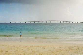 与那霸前滨海滩位于宫古岛西南部,以其绵延约七公里的辽阔海滩以及白色细砂质地著称。海滩与来间岛隔海相望,位于东急度假村的前方。另外,它还因为是铁人三项比赛的游泳赛区而名扬海外。