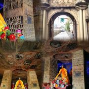 5分 超棒主窟伽兰护法殿,平面呈方形,宽8米,进深11.6 米,高4.7米,窟顶前平部有平基15格,内浮雕花草、瑞兽等图案,后半部中心为穹隆顶,中为八卦外围浮雕一周结迦跌坐小佛等。窟正面下凿成长方形石坛 基,上有3个须弥座,两侧各有一长方形石坛基,窟中有两根长方形石柱,直达窟顶,宽1.26米,厚19米,上凿刻小佛及题记,在柱中部岩石断层不宜雕像 处,改用彩绘,窟两壁凿刻形态各异,造型多样的小佛,间以题记,总计右壁小佛15层,每层165身,右侧20层,每层165身,再加二柱约万余尊,题记 25块,其中有“天佛洞始营为拒虏设„„。”及清代榆林籍名书法家叶兰手书“灵应”等。窟内各窟移来的石造像12尊,残碑1块,龟形石碑2个。