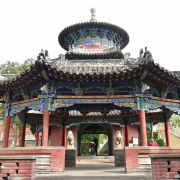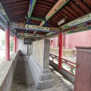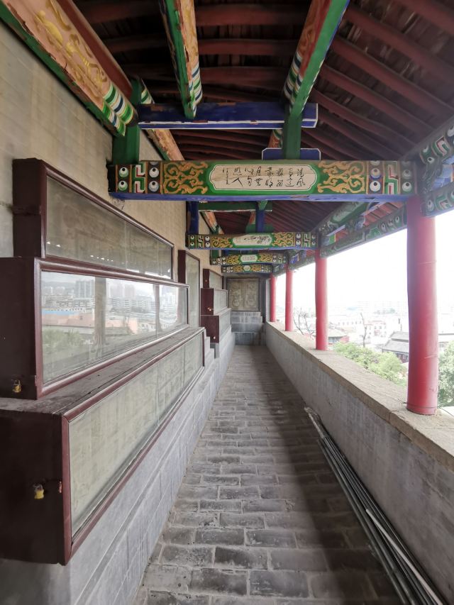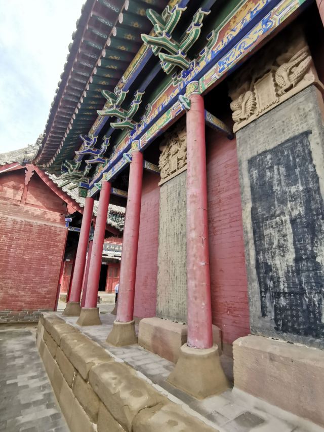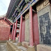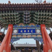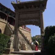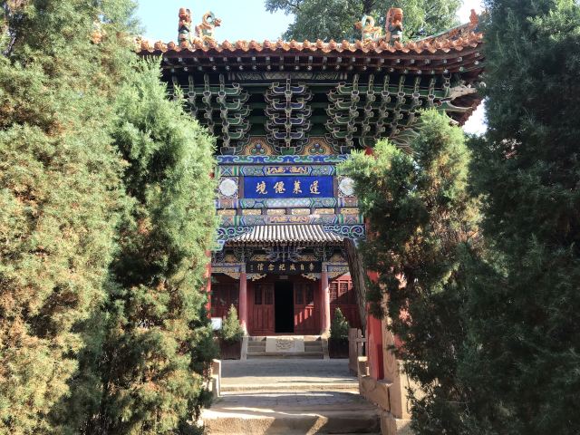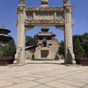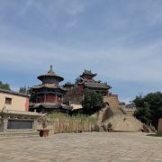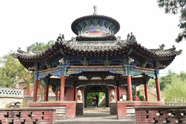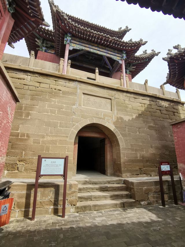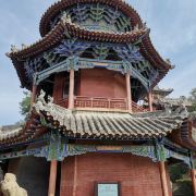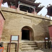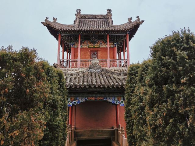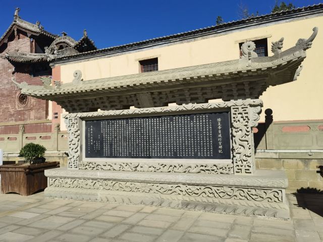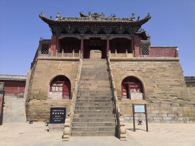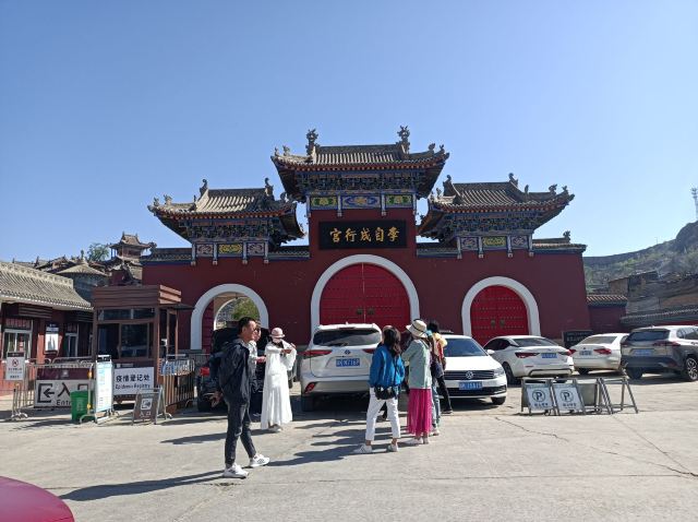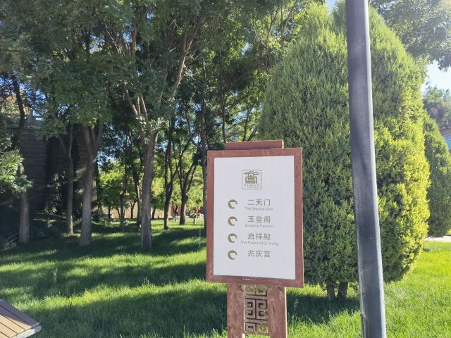 行宫建筑群:行宫依山据险,前后两层共90级台阶,将乐楼、梅花亭、捧圣楼、二天门、玉皇阁、启祥殿和兆庆宫等建筑联结托起,布局严谨,气势雄伟。