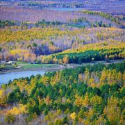 三个半岛皆丛林茂盛,层树秋色。中方地势且高,伫立北极岛俯瞰银环岛,美景极目。