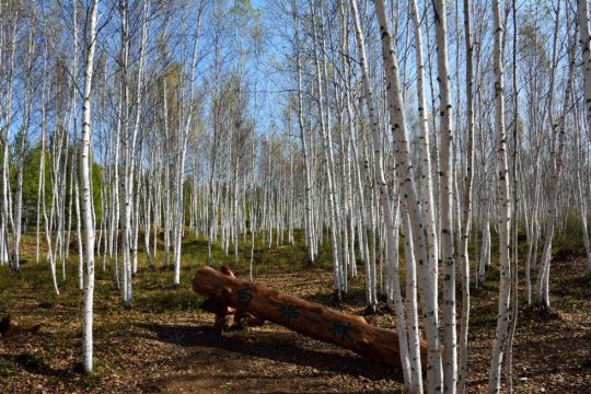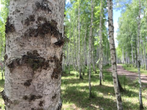 走进白桦林中,引人注目的是白桦树的树皮,不时有开裂翻卷的。若乘势剥下,是一层又一层紧密结合在一起的桦树皮。桦树皮色泽很好,浅黄色,带着淡咖啡色的细斑点,又十分坚韧,剥至薄如蝉翼的一片,也撕不开它。当地人用桦树皮做成匣子、袋子等实用品或工艺品,鄂伦春人甚至有用它翻盖屋顶或做成桦皮船的。
