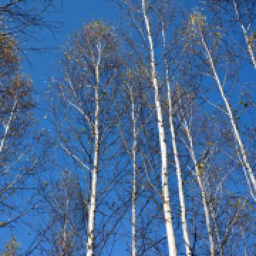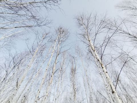 白桦树有点像北方的白杨,挺直、伟岸,如剑戟直向北国长天。也有一二株、三五株长成枝桠分叉、树冠圆阔的大树的,展示出白桦树的另一种风姿。白桦树一般与落叶松、獐子松混生在一起。也有单独的白桦林带,公路沿线的白桦林带是一片风景,一道道密麻麻的白灰色树干闪烁而过,有时风起,树顶的树叶被风吹翻卷,露出叶子反面的银白色,宛如开出半树半树的白花。