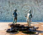 主体雕塑是一对年轻的哈尼族夫妻,哈尼妇女肚子突起。夫妻俩弯曲双腿、手持贡品,他们正向天神祈求,保佑他们的双胞胎平安降生。一方水土养育一方人。在墨江,由于人们常年喝双胞水,也就促成了生双胞胎的重要条件之一。双子星广场上的阴阳井,北回归线刚好从两口井之间穿过。 想要求双胞胎的夫妻,到这里就要喝一喝阴阳水、睡一睡双胞床,然后还可以结一把同心锁。