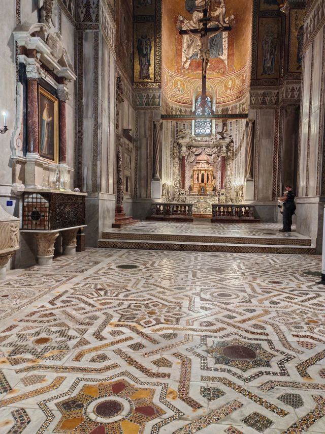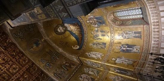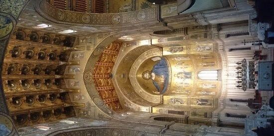 走进教堂内部,令人震撼的是覆盖了整个穹顶与墙壁的金色马赛克镶嵌画,总面积达 6300 平方米。这些画作以《圣经》故事为主题,描绘了从创世纪到末日审判的场景,人物栩栩如生,金色背景在光线照耀下熠熠生辉,营造出神圣庄严的氛围。祭坛后方的耶稣基督马赛克像尤为壮观,是教堂的视觉中心。除了马赛克艺术,教堂内还有精美的大理石柱子、雕刻繁复的木质祭坛等艺术珍品。
