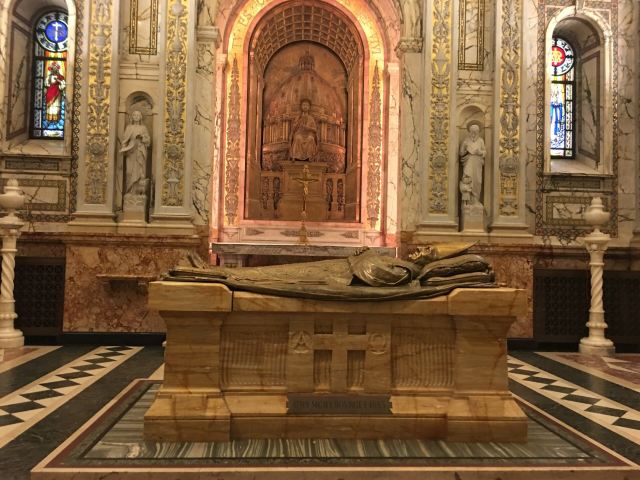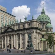 5分 超棒世界玛丽女皇教堂是蒙特利尔第二大教堂,魁北克省第三大教堂,仅列于蒙特利尔圣约瑟夫大教堂和魁北克的圣安妮大教堂之后。该教堂修建于1870年至1894年间,外观整体气势壮观,绿色圆顶和门前的巨形石柱表明了新文艺复兴时代巴洛克的建筑风格,屋顶上的十三尊雕像代表了蒙特利尔十三个教区的守护神,这在蒙特利尔市仅此一家,不同于罗马圣彼得大教堂前面的12个基督使徒。教堂内部非常宽阔宏大,装饰华丽典雅,有很多绘有宗教故事的壁画,阳光从彩绘玻璃中透进来给幽暗的教堂增添了一丝生气,陪伴我们在神秘与现实中徜徉。教堂祭坛的华盖很有特点,金光闪闪,造型别致做工精美。教堂祭坛华盖由紫铜为材料手工制作,金箔装饰,金光闪烁,华丽高贵。