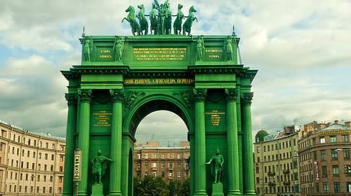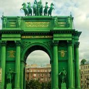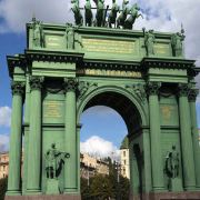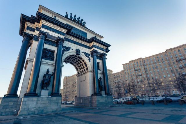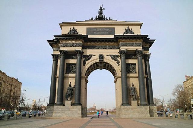 该建筑高28米,门顶是一尊手执月桂花环,背生双翅驱驾六套马车的胜利女神像。其下武士,手执利剑,或月桂花环和橄榄枝,象征胜利和平。门柱之间,四尊俄军士兵,身披盔甲,手执盾枪,手指上刻着“驱逐法兰西,解放莫斯科”,整个造型气势宏伟,不愧是个拍照留影的好地方。