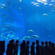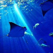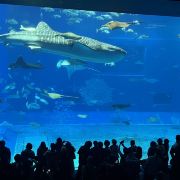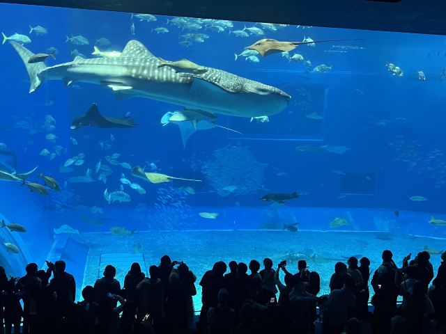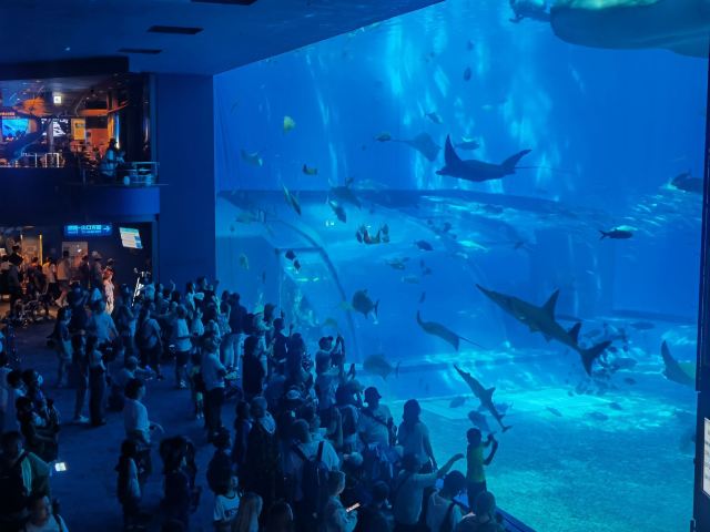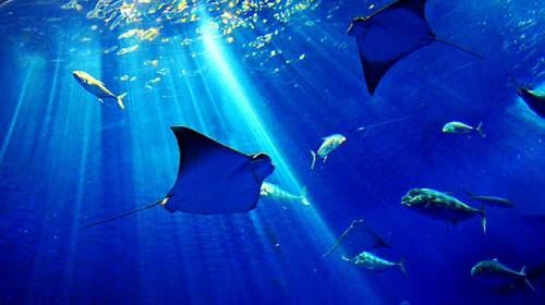 美丽海水族馆的黑潮之海,是世界上最大的饲养鲸鲨的水槽,贯穿水族馆的一、二两层。这里游弋着世界上最大的鱼类鲸鲨,还有首次人工繁育成功的鬼蝠魟。