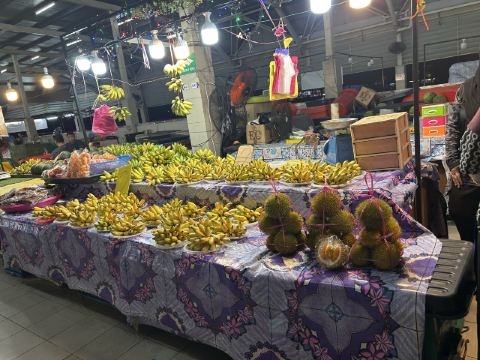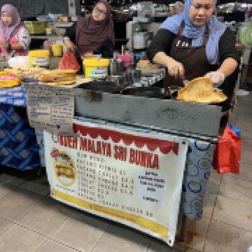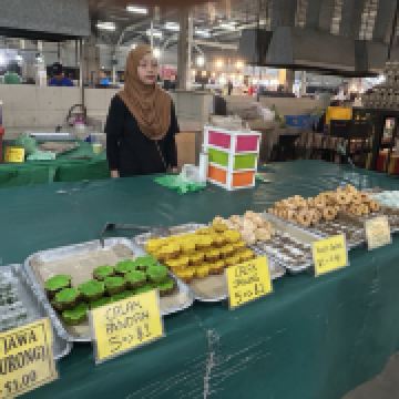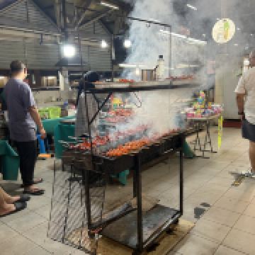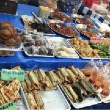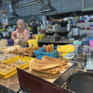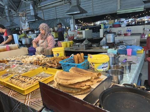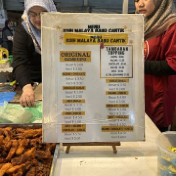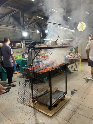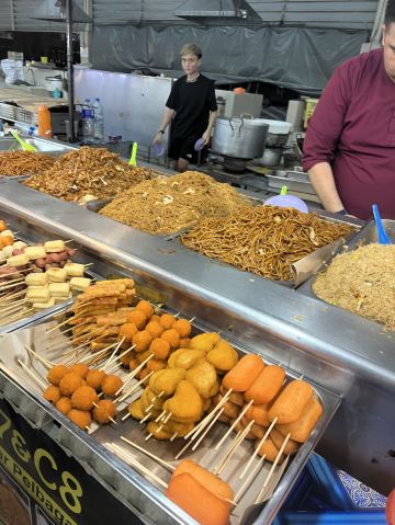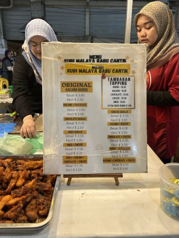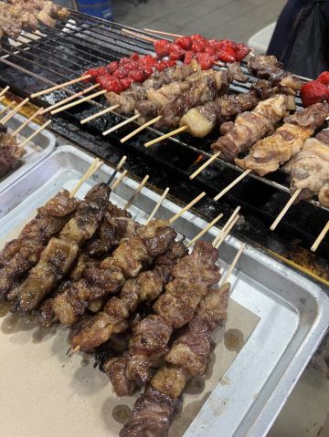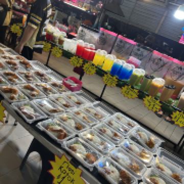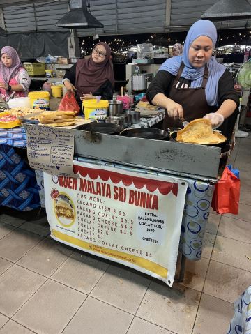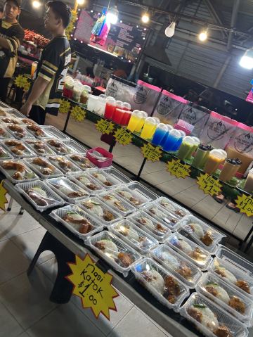 又被称作“一元夜市”,很多小吃1文莱元起;有很多卖炸鸡米饭的摊位也有羊肉抓饭很好吃,还有一些烧烤烤鱼,红彤彤的烤鸡屁股,每个来的都要试一下,还有烤羊肉串很好吃,加了很多芝士和炼乳的煎饼,我很喜欢吃。有各种各样的饮料大部分都是1文莱元。椰浆饭、沙爹、阿莫伊特(ambuyat)、热带榴莲/芒果;价格相对都比较便宜,但是榴莲之类的热带水果还是比马来西亚那边贵的。