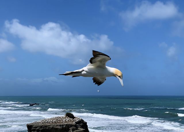 鸟岛距离奥克兰中心区约一个小时的车程,占地十分广阔,一直延伸至海上的两个相互垂直的岛屿。停车场的附近有一条短程的步行道直接通往观景台,在那里可以更清楚的看到岛上的美景。每年从8月份开始,一直到次年的3月份,有大约1200对的塘鹅在这里筑巢,而各个巢之间距离只有几厘米,而塘鹅却能避开同类的尖嘴准确的停到自己的巢前,十分的精妙。塘鹅体重约2.5公斤,鸟翼约2米长,因此飞行时也很是壮观,让人印象十分深刻。