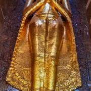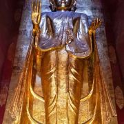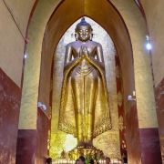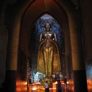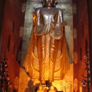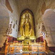 佛塔的底座是印度风格的正方形大佛窟,东南西北面皆有一座高门,门内各是一座高约十米、姿态不同的站立金佛。其中南北两尊是原有的金佛,而东西两尊曾损于火灾后重建。南面的金佛令人叹为观止,据说远看时大佛笑得非常慈祥和蔼,而走到其脚下抬头望去,法相却变得十分庄严,令人不由自主要膜拜。