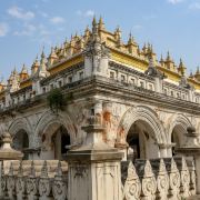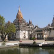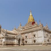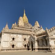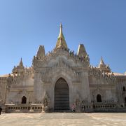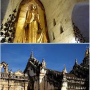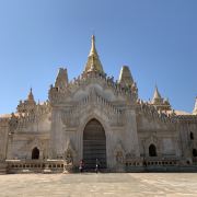 阿南达寺集古代建筑之大成,整个寺院呈正方形,占地近百亩,是完全对称的形态,四面各有一条长长的走廊通向中间的院子。脱鞋后方能进入寺庙。寺院的正中间就是阿南达塔,高约51米,白色的塔身层层叠叠,玉米穗一般的印度式尖塔则涂满了金箔,并镶嵌着无数光彩夺目的珠宝,在阳光照射下显得尤为宏大耀眼。佛塔的外壁上有上千大小佛像和佛本生故事的彩陶浮雕,虽历经风雨只能略见绿底,但依然能看出世尊苦修、冥想然后彻悟成佛的过程。在主塔的周围又环绕着众多的小塔、佛像及各种动物、神兽雕像。