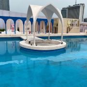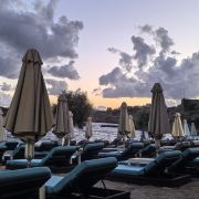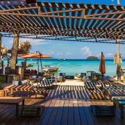 走进来之后穿过了露天酒吧就会看见眼前海滩上有一整片蓝色躺椅,配著蓝天空、蓝色海水,