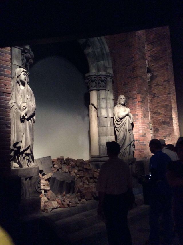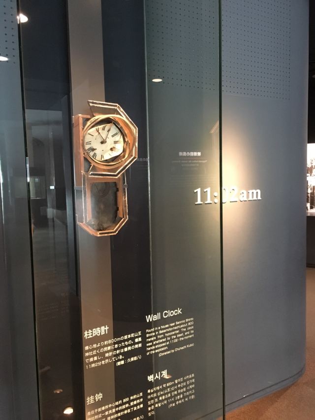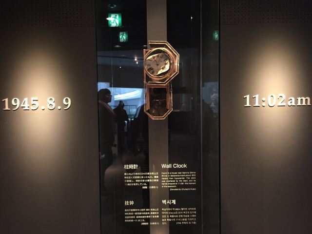 长崎原爆资料馆坐落于一个被炸毁的教堂之上,教堂仅仅剩下一面墙,至今,你依然可以看到一面被冲击波毁坏变形的时钟挂在墙上,时针停止在11点02分。