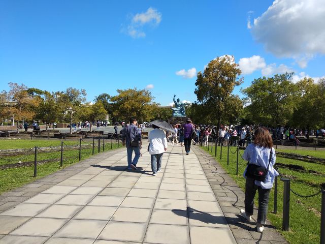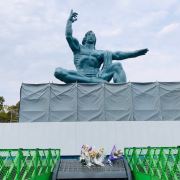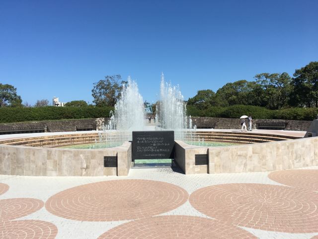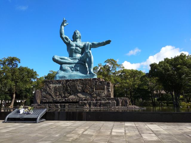 5分 超棒长崎平和公园内有许多各国捐献的雕塑,也象征着世界各国的和平友好吧。 这座雕塑最为出名,很远就能看到。 雕塑的人物形象很欧化,作者是日本人北村西望。 这是在原爆10周年的时候募集资金建成的,为了祈求世界恒久的和平而建。 介绍说雕像的左手表示和平,右手表示原子弹,在为牺牲者冥福。