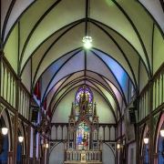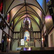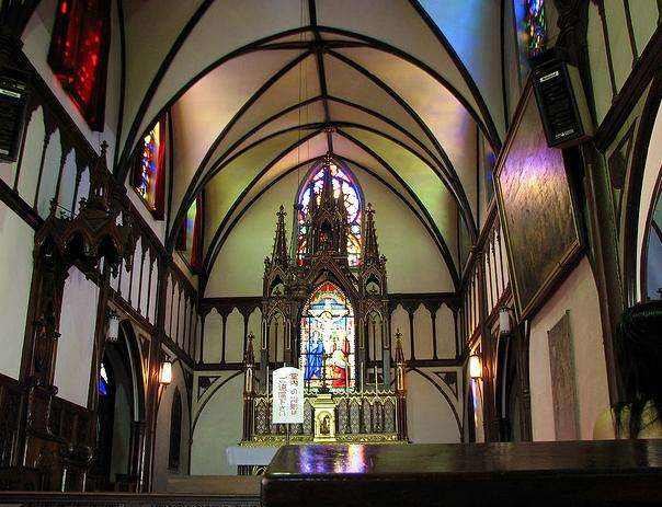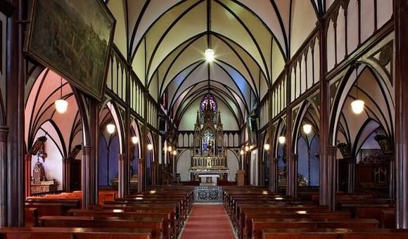 教堂内部镶嵌着100年前的法国彩色玻璃,是日本古老的彩色玻璃。虽然因核爆和台风影响,有一部分是遭受损毁后进行了修复,但现存的大部分都是1879年改建时就镶嵌而成的。美丽的光线集中于教堂内,扩大了祷告空间。
