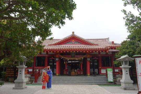入口处右侧是至圣庙和护国寺,左边为自动车练习场。神社的红瓦屋顶具有强烈的冲绳文化色彩。