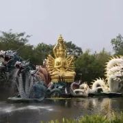 最震撼的当属圣佩奇宝殿。这座1:3复刻的已沉没古寺,被浇筑成混凝土永恒。工匠用喷砂工艺伪造岁月包浆,裂痕精确到毫米,连青苔都采用永生苔藓标本——真实与虚构的边界在此彻底崩塌。另一侧的无畏神战象广场,三头巨象雕塑的眼珠竟用汽车大灯改造,在黄昏亮起时投射出赛博朋克式的神性。