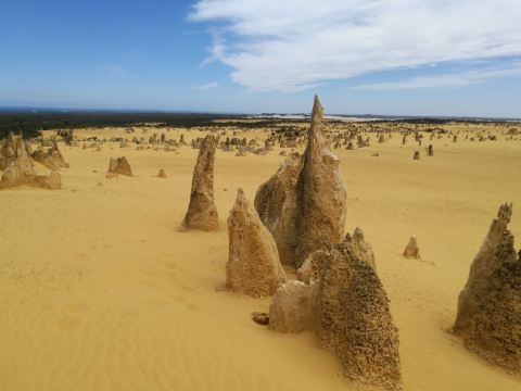 当年荷兰探险家从船上望到这片石灰岩柱的沙漠景观时,还以为发现了一座远古时代的城市废墟。实际上这些尖塔式岩石景观是一中地质变化的自然现象。大约在3万年前,长在稳定的沙丘上的植物根部,经过长时间的风化,形成了石灰岩,植物死后,沙丘的不断移动,使这些钙化的石灰岩露出地表,形成了现在所看到的石笋。