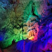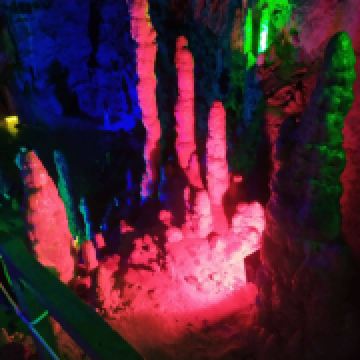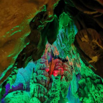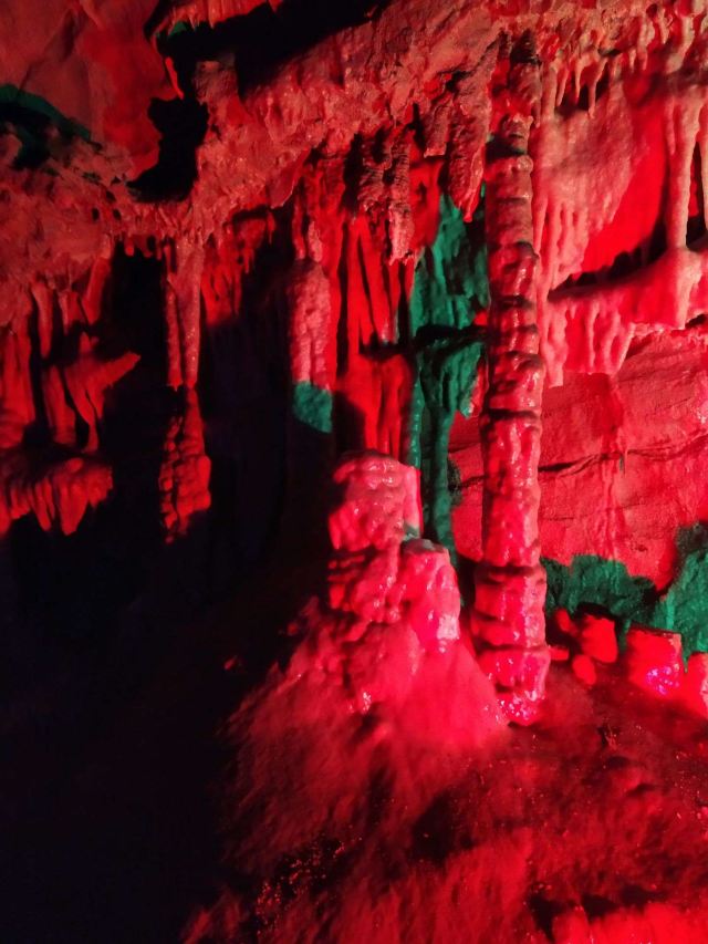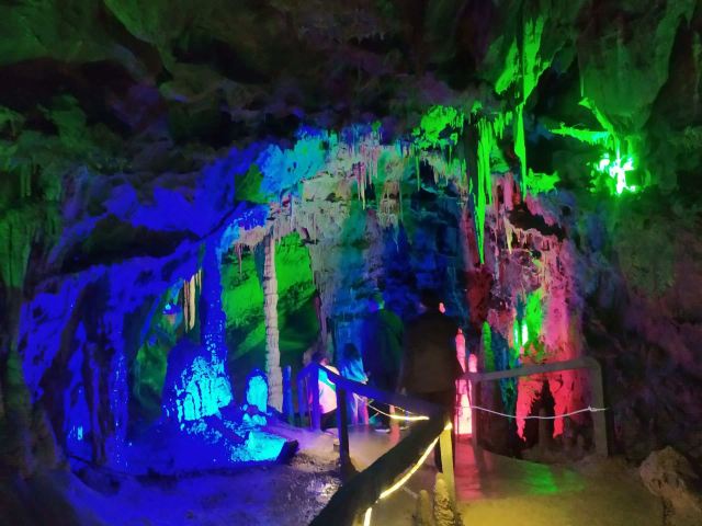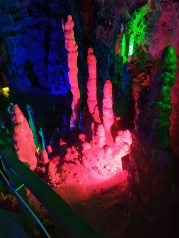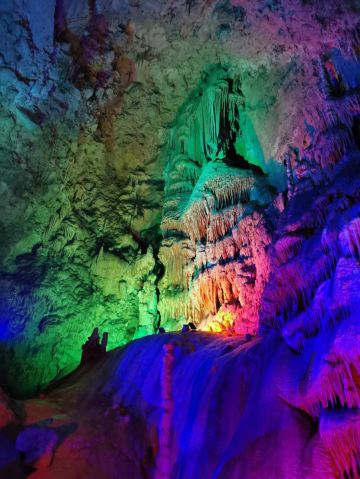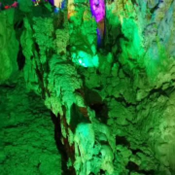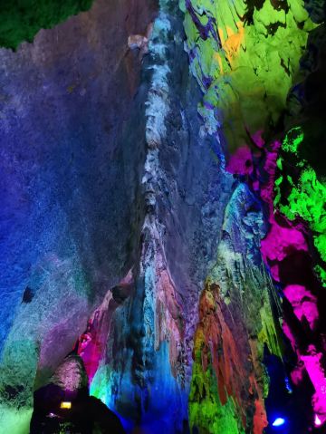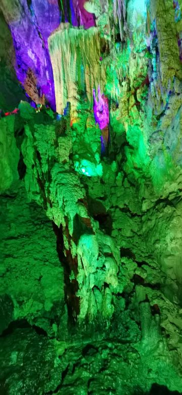 第三部分是溶洞,有两个,山上那个我没去,只进了五彩洞。洞口很小,可洞很深。洞里有河,每一块石头都在滴水,属于发育期,可以看到很多晶莹剔透的鹅管,是那些成名已久的老洞所没有的。到最深处,低头看了看深不见底的深谷,一回头,“洞神”在高处俯视着我,吓我一跳。真的很像。景色不错,总体超赞,