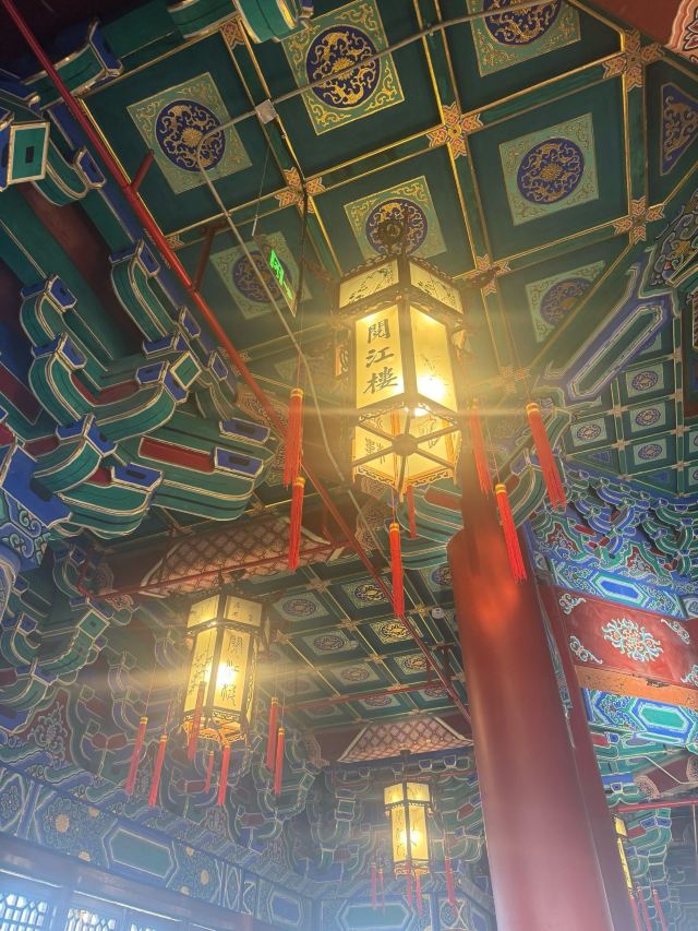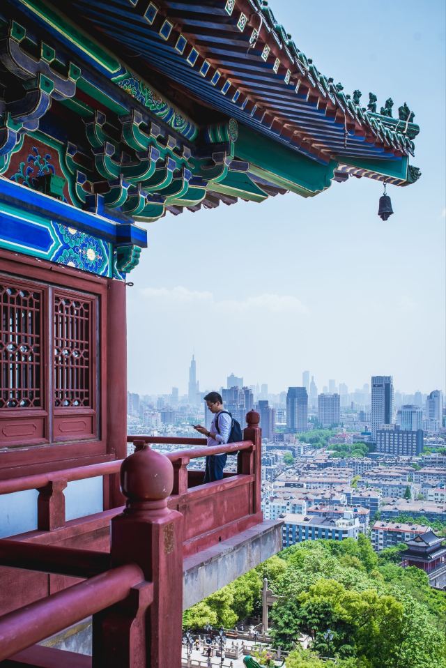 阅江楼高52米,外观四层暗三层,共七层,每一层都有和明代相关的陈列,虽然也是现代新布置的,但像一层的红木龙椅、三层绘着郑和下西洋的巨型瓷、四层天花板上用整根香樟木雕成的金龙,将楼内打造得挺气派。站在楼上,天气好时,北边的长江、南京长江大桥,东南边的紫金山(钟山),以及南京城景尽收眼底。长江被落日映成金红色,添了几分温柔。