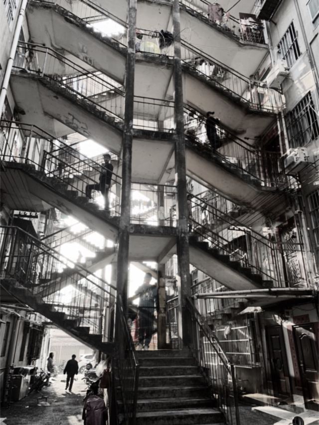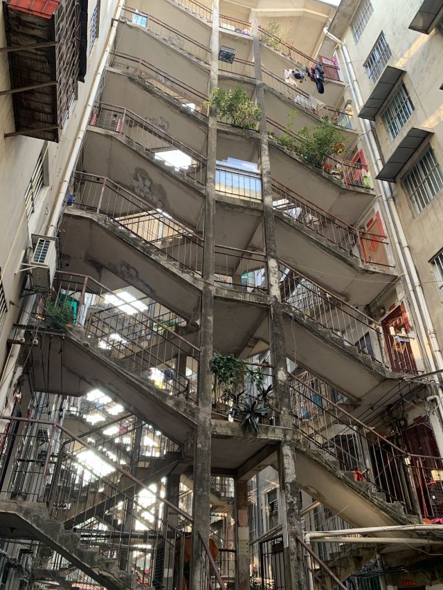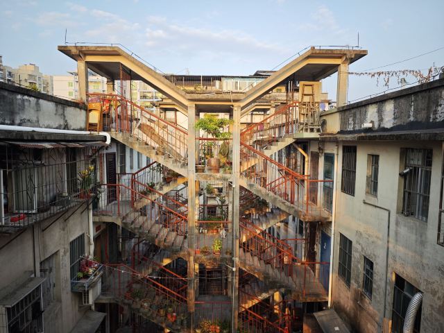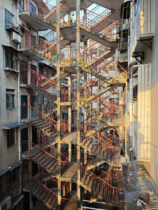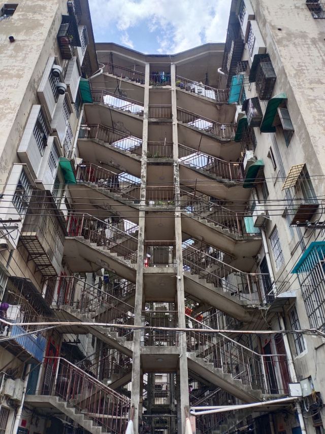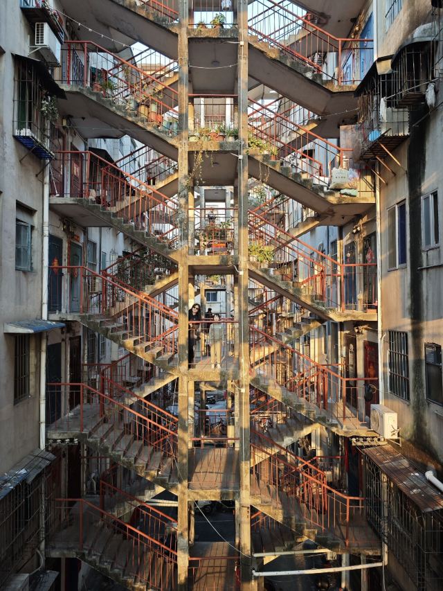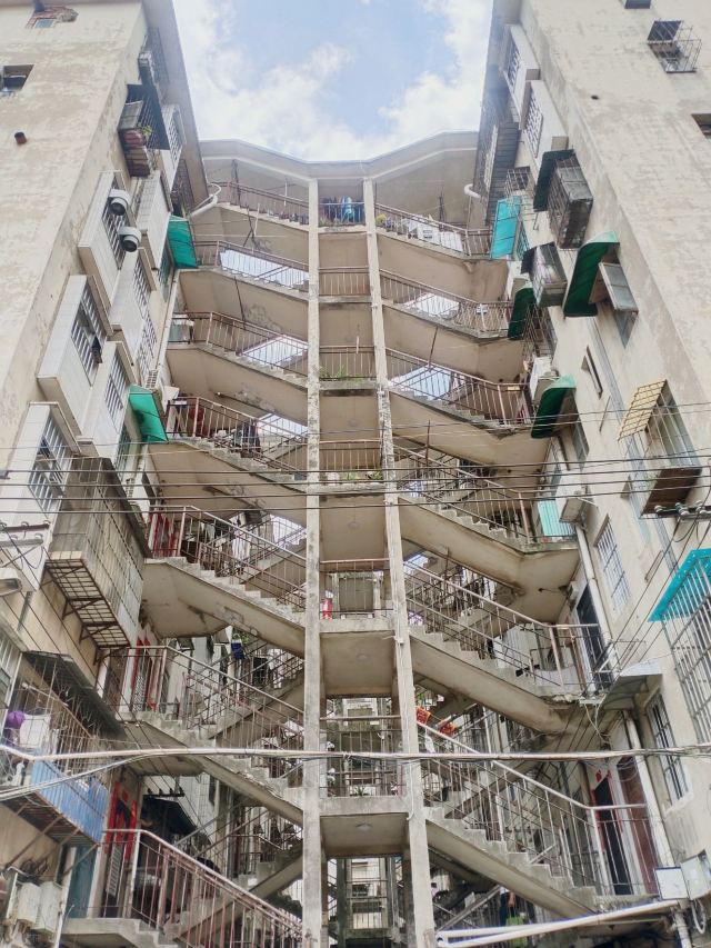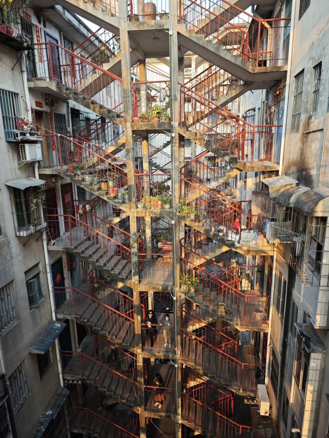 南宁的唐山街28号鸳鸯楼,楼梯纵横交错,四通八达,将两栋楼连接了起来。连通建筑,也联络了感情。楼建于1987年,已有30年的历史,外表有点老旧,不过环境干净整洁,地上极少看见垃圾,一梯两户,大门相对,视野开阔,4栋楼,168户人家,紧紧连接在一起,居户以老年人为主,生活气息厚重,别具一格的城市印记,其中点缀的绿色植物又显得勃勃生机。现成为网红打卡点。