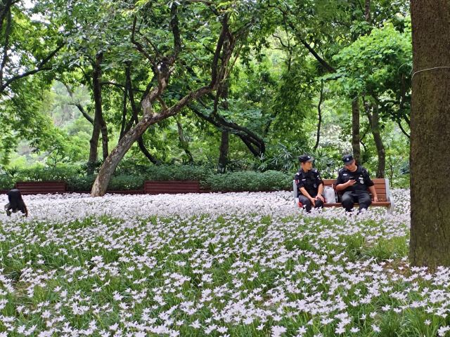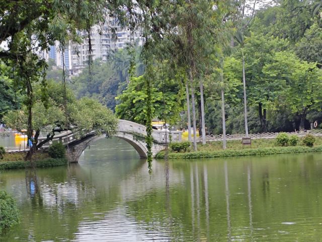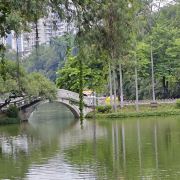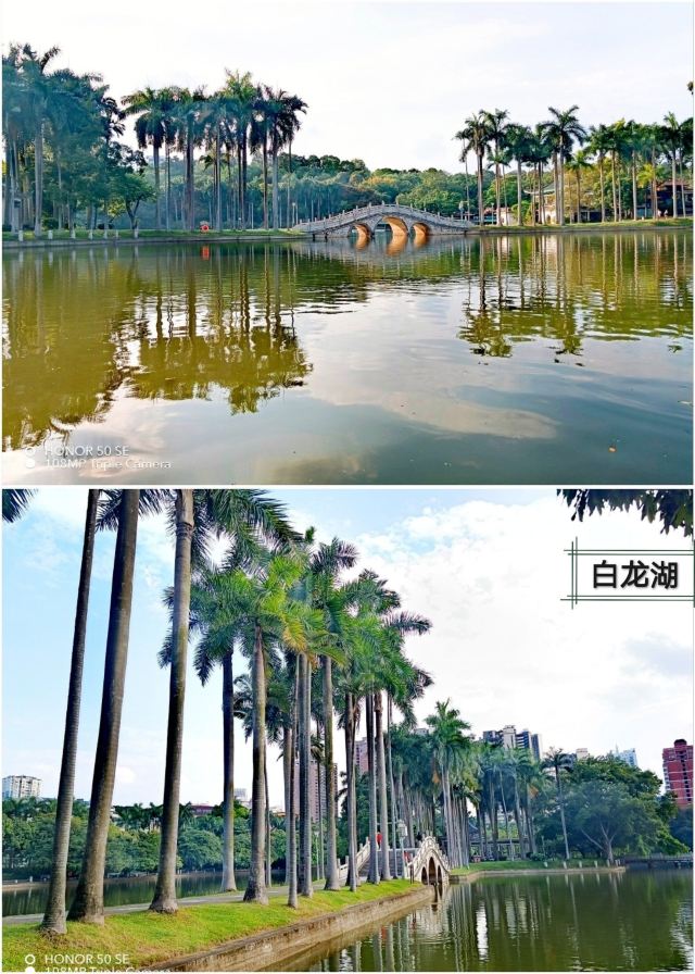 - 白龙湖:公园内的核心景观,湖水澄碧,湖岸翠竹掩映,垂柳摇曳。湖心有小岛,岛西的九曲桥和岛北的三孔月桥将岛与湖岸相连,湖面的游艇穿梭其中,构成了一幅美丽的画卷。