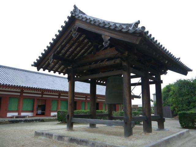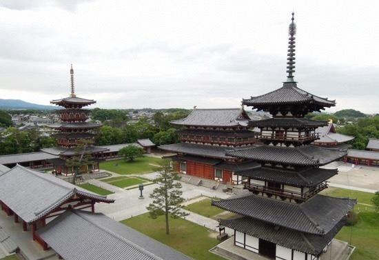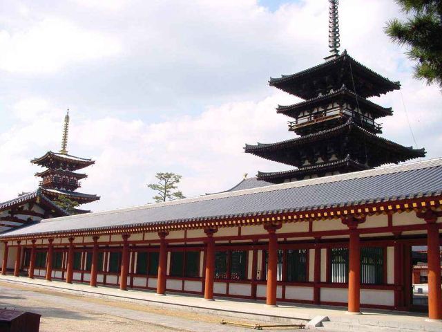 天延元年(973年) 遭火灾,除佛殿、东西二塔外,余皆焚毁。后经数度重建,今除东塔外,他如佛殿、讲堂、东院堂等,皆江户时代之建筑。东塔为三重塔,每层各附有裳层(图4⃣️),状似六重塔,为奈良前期之遗构,以九轮上部附加水烟之天人图案为最美。佛殿所供奉之三尊药师佛像,亦为奈良前期金铜佛像铸造中之杰作,虽遇灾变,其表面犹显黑亮之光泽(定期限时公开)。