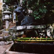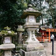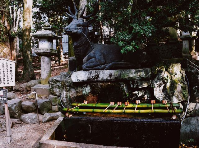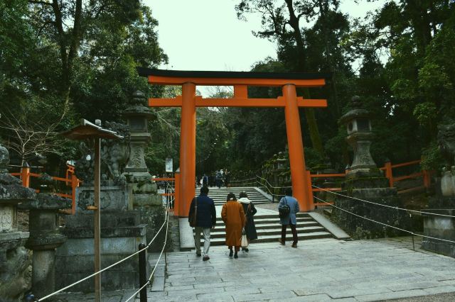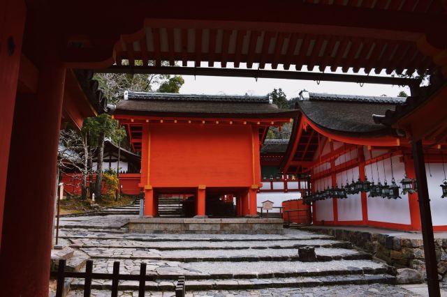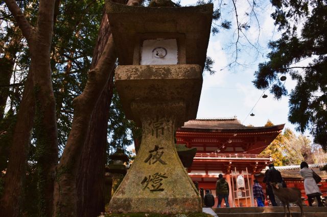 微信小程序春日大社是日本神道教的宗教参拜场所,建立于710年,已经被列入世界文化遗产的名录。它供奉的是藤原家的四位守护神灵,如今是全日本重要的祭祀场所。整个神社依靠在春日山山脚下,周围被苍翠秀丽的植被所环抱着,春日山向来禁止砍伐,因此这里的一切都显得自然而古意。萌萌的小鹿签和古老的紫藤沿着台阶拾级而上,穿过南门,便正式进入了春日大社,进门左手边就可以购买祈愿的御守、写一个绘马或是抽一只小鹿签。在这个院落里有一株树龄700年以上的紫藤株,枝桠盘区在架好的木棚之上,春天开花时候的紫色花海非常美丽。进入本殿首先是供参拜和祈愿的神龛,往内便是神社的主殿。西回廊和直会殿之间悬挂有一排错落有致的铜灯笼,配上朱红的日本神社建筑,很有特色,这里也是游客拍照的热门取景地。穿过舞殿便进入了苹果庭院,因这里种有一棵苹果树而获此名。依偎在直会殿正面的是一棵巨大的柏树,据说有着800-1000年历史,为独特的是有一棵分枝从直会殿的屋顶破洞而出,茁壮生长,也是这颗古柏的生命力的体现。位于神社里进的御本殿和后殿,整个建筑表面全部漆成朱红色,院落内也陈设了许多日本神教的建筑,比如祈祷长寿的多贺神社。数量众多的小型神社从二之鸟居前往本社的参道、即出了本社继续往南,小路旁密布着数十家大大小小的摄末社。它们都位于春日大社境内,或是因为祭祀的神明和春日大社的主神有着深厚的关系,或是接受着春日大社的管理,其中不乏有的夫婦大国社、金龙神社等人气颇高的神社。
