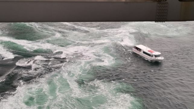 鸣门涡流景观可搭乘观光客船从近距离观赏,也可自跨越鸣门海峡的大鸣门桥内的涡之道从45米高的空中瞭望。