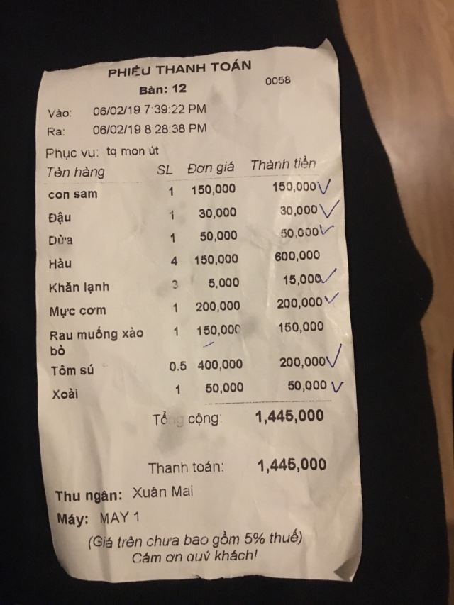 不想被骗的一定要看此条!一定要看!占婆塔挺美,门票也很便宜。也有很多善良的商家。但是我写这个评论,主要是提醒中国同胞,千万不要去占婆塔附近的海鲜一条街吃饭!千万不要!各种欺客宰客!在水缸旁点海鲜的时候没有价牌,就算问清楚了,甚至我都在计算器上面按好了给店里的人看了点头没问题了,结账的时候依然理直气壮的乱来!一盘空心菜说好的5万盾,结账的时候非说15万盾!生蚝也是5万变15万!!而且烤好了端上来是又生又臭!一个椰子点的时候说3万盾,结账的时候非说5万盾,这已经是很良心的了。还有,结账的时候莫名其妙钻出来很多5万3万15万的根本对不上号的,结果是一上桌就摆上的一小碟不新鲜的盐水花生和水果等!点的时候都能讲中文,一出问题就说听不懂!更恶劣的是,几个店老板坐在路边,就说点货小哥报错了价,意思是:吃客你们就认栽吧!他们很心安理得的!鲜点现杀的海鲜餐厅都别去吧,就算是海滨路上的有价目表的,照样宰!他们在结账的时候会说:刚才你们点的这个价格表过期了,现在春节,给你们的价格是另外一份!同酒店的另外一家人遇到的!发几张照片,就这样的几盘菜。最后一张是我们的结账单,顶上是海鲜一条街这家餐厅的名字。里面就算是打了勾的,也是有对不上号的!我们可以去观光和旅游,理性消费,但是不能去做一个“人傻钱多”的中国人!