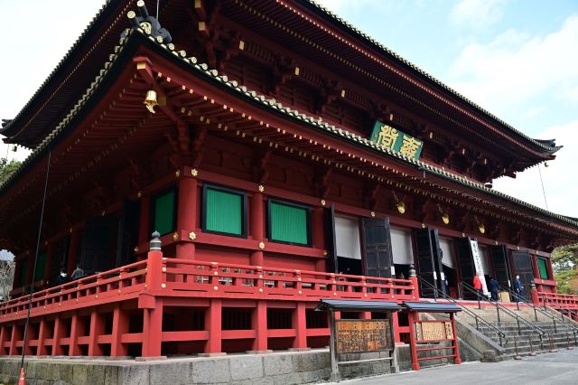 三佛堂的对面是寺院的宝物殿,里面收藏着与佛教和德川家族相关的陈列品。宝物殿旁边有一座小型日式庭园——逍遥园。