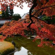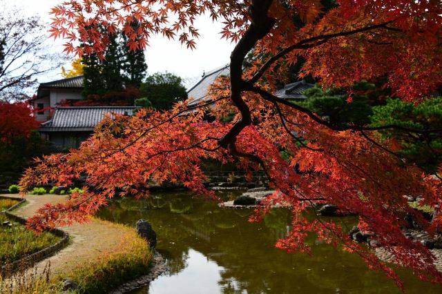 踏入昏暗的本堂,古佛垂目,时间彷佛凝结。转过回廊,忽见庭园一角枫烈如火,与青苔石灯构成惊心动魄的对比。风起时,檐铃清响与落叶簌簌声共鸣,彷佛听见了岁月流转的叹息。