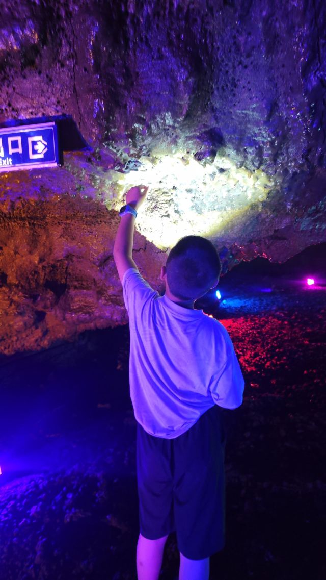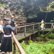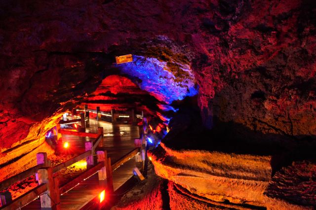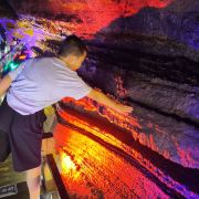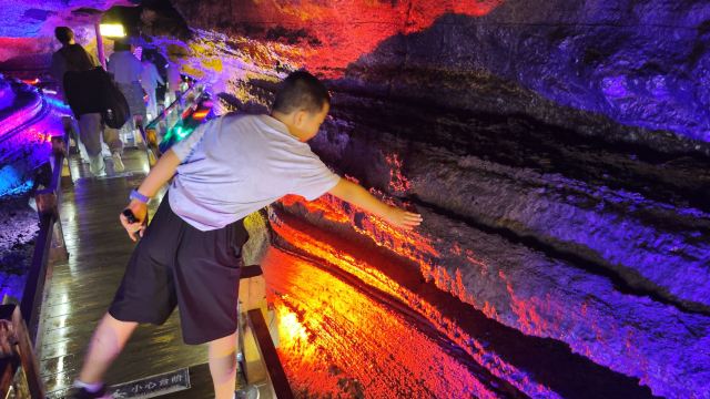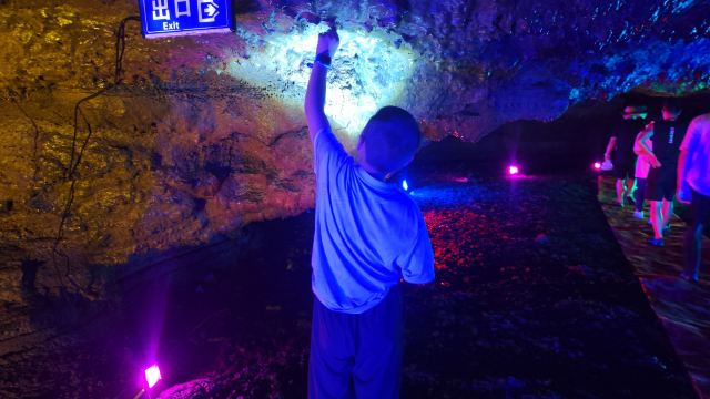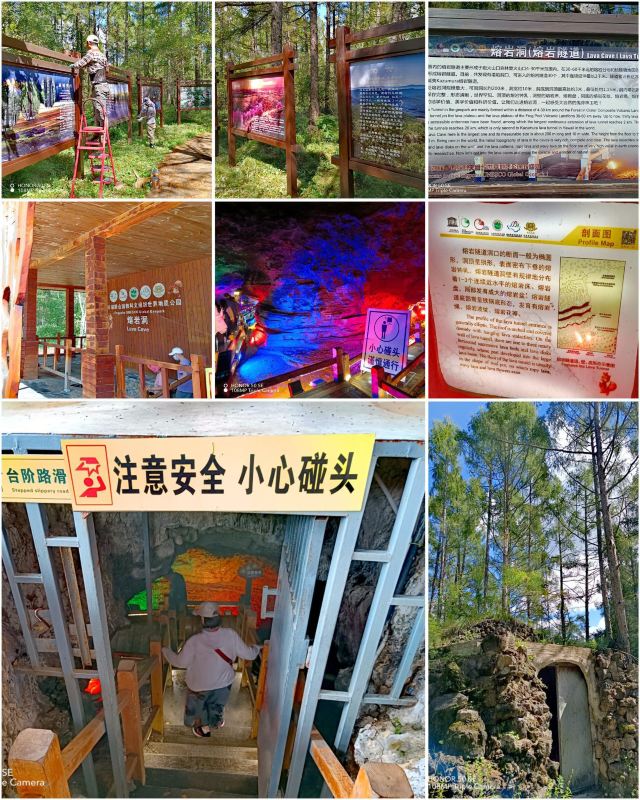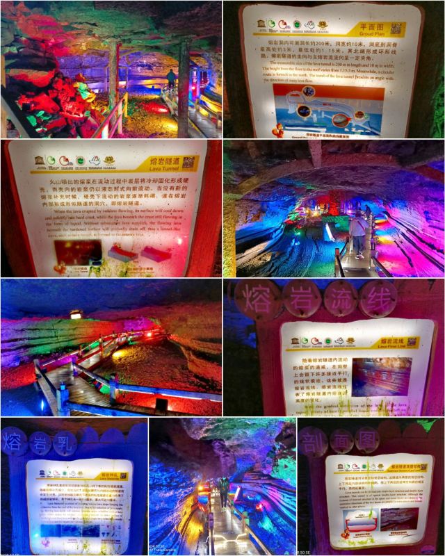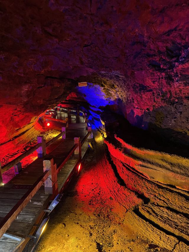 2、2小时车程后到火山口国家森林公园,省外游客需提供48小时核酸证明,火车站就有免费核酸点。坐观光车到第一站“熔岩洞”,洞全长27公里排名世界第二,但目前只开发了100米,是当年东北抗日联军挖的隧道,洞内被灯光照得五彩缤纷,能欣赏“绳状熔岩”、“熔岩流线”等各种熔岩地貌,洞里有一小段封闭了,其它地方不到10分钟就能走完,如果把科普介绍牌看完会多花点时间,跟团游时间紧来不及阅读的话可以先拍照,在车上慢慢看。