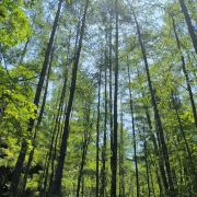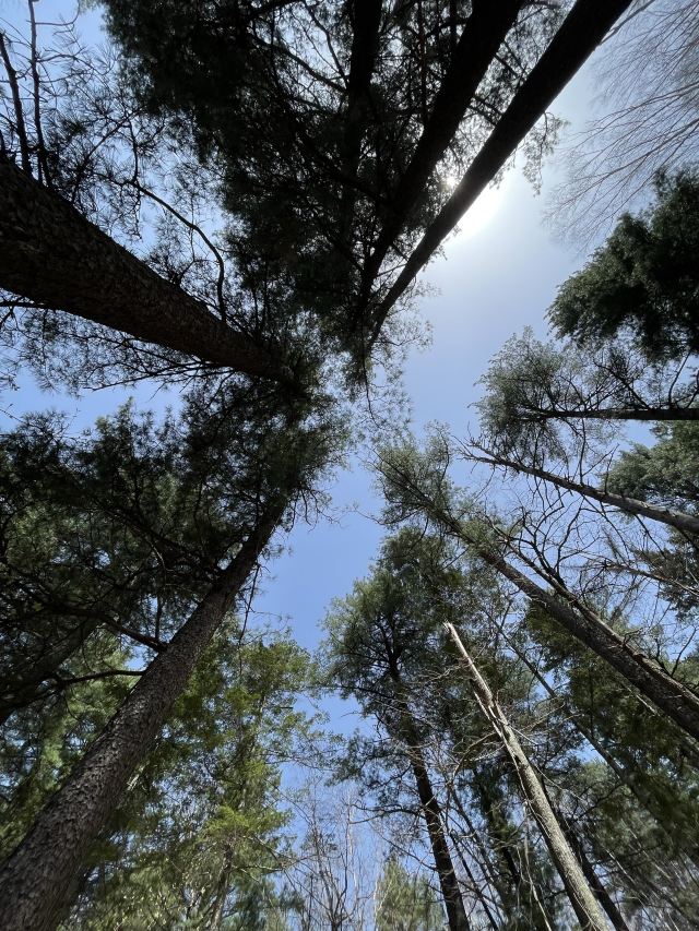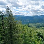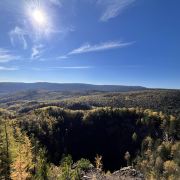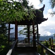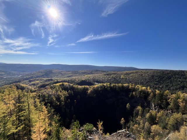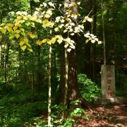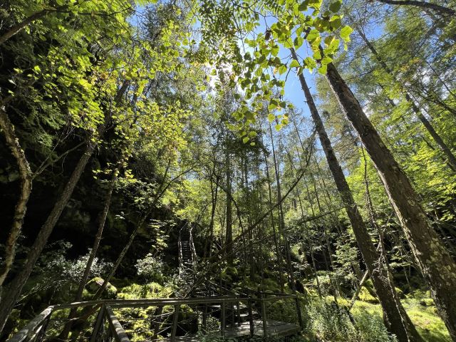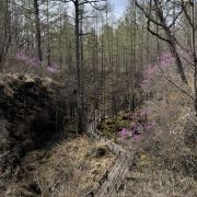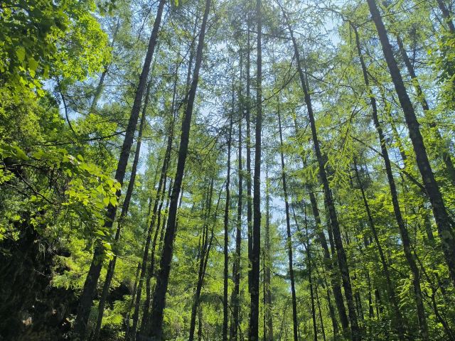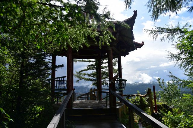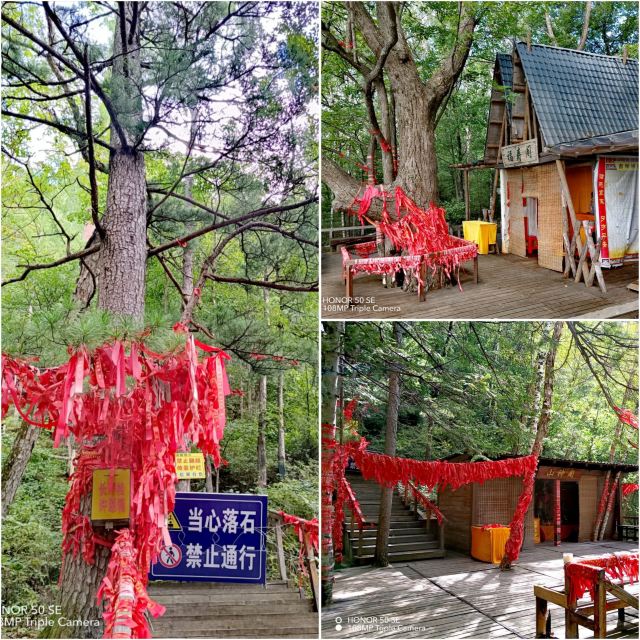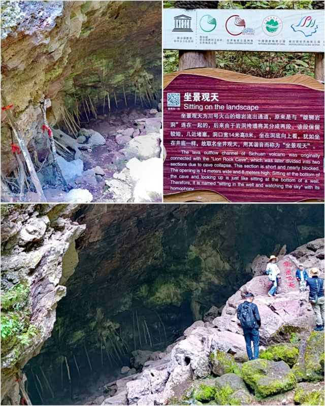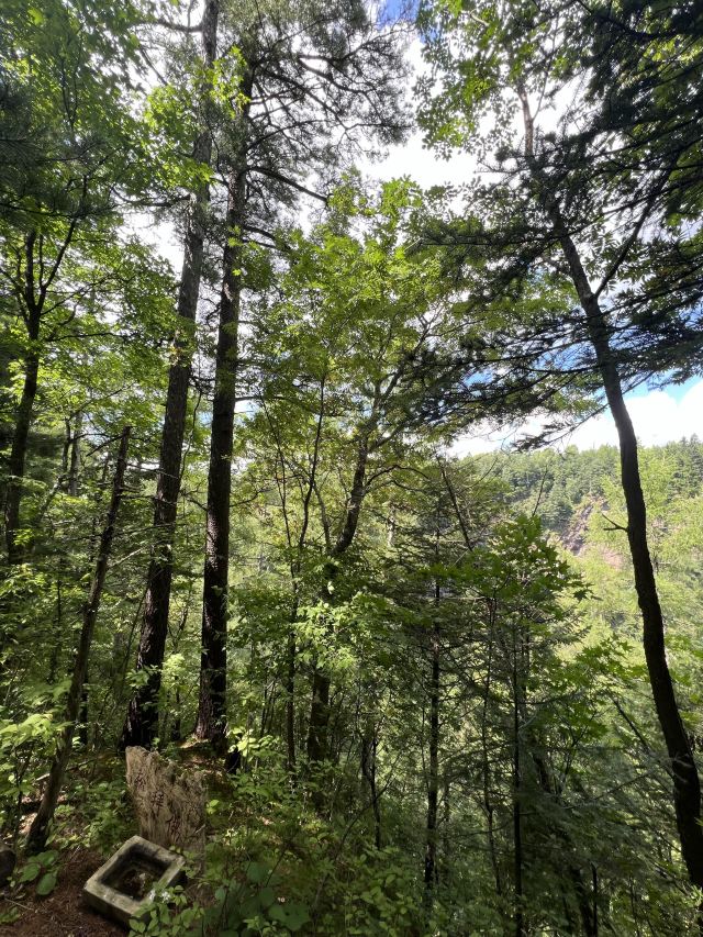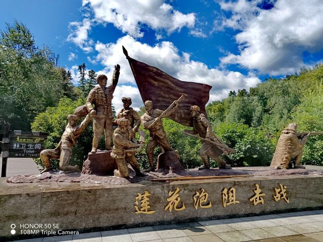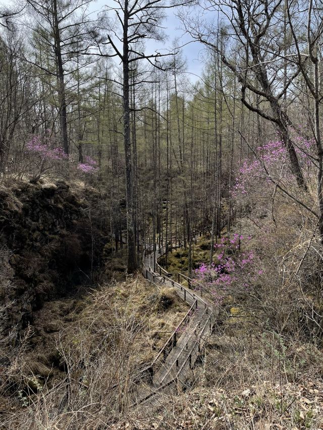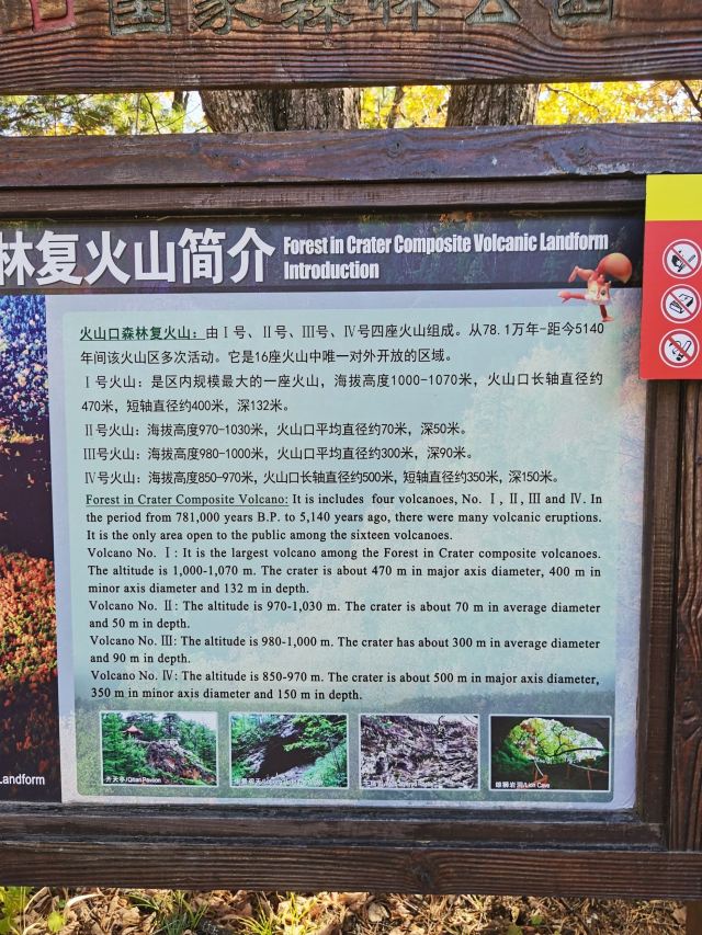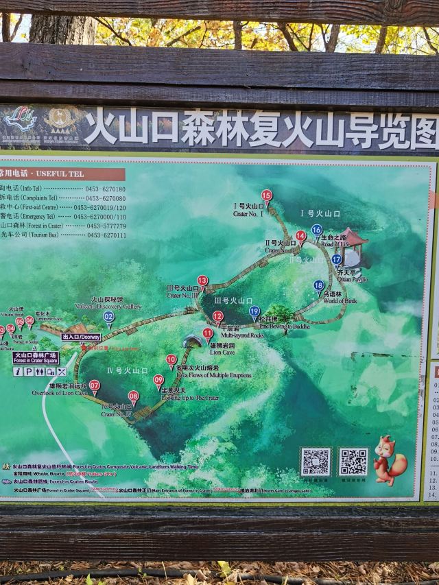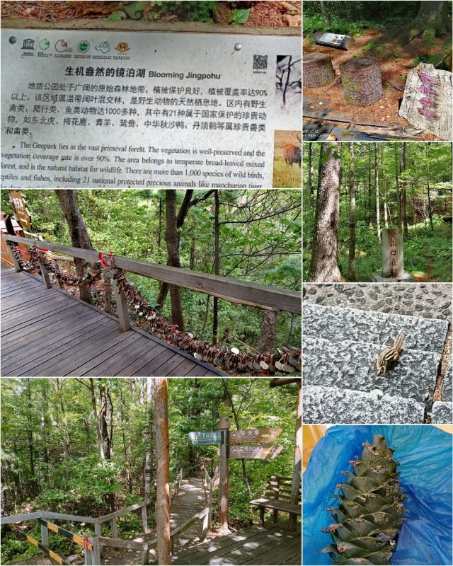 3、继续坐观光车到景区精华部分,即1万年前由火山喷发形成的4个火山口。入口处有“火山口抗联密营纪念馆”(不开放)和“莲花泡狙击战”铜雕(1936年的一场小规模抗日狙击战,击毙日军70多人,我军牺牲78人)。进入高耸的针叶密林区,斑驳的阳光洒落周遭,我们在分岔路右拐前往4号火山口,为了在跟团游限定的时间里多去几个景点,我在步行道中疾行10分钟后到“山神阁”,阁四周红带飘飘是祈福圣地,旁边高大挺拔的“长寿松”也是拍照祈福处。拜完后下石梯便是4号火山口,幽深巨大的洞口像巨兽的血盆大口令人不寒而栗,洞口外“坐井观天”石碑是拍照点。由于时间紧我没等游客散去就赶紧拍照返程了(再向上通向“雄狮岩洞”的山路被封了),沿途好几次遇见条纹松鼠,同车游客还有遇到小蛇的。