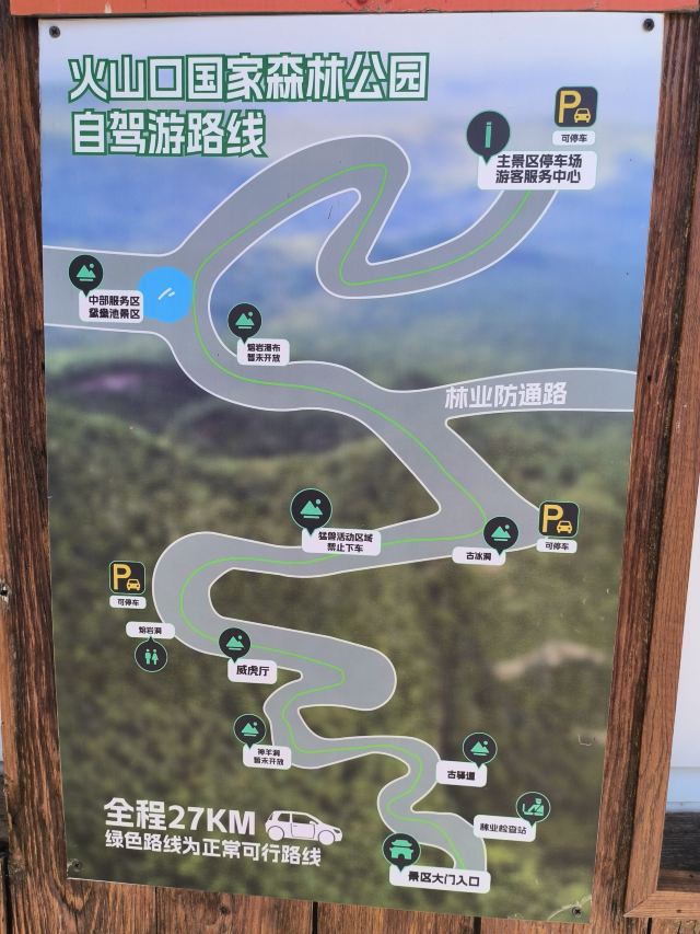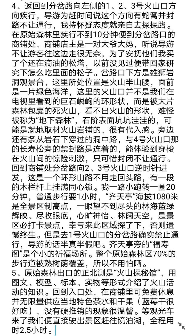 5分 超棒进入景区需要购买大巴车票全程27公里,有三个停车点。第一个停车点是长度约200米的熔岩隧道,可以穿行。第二个停车点是冰洞仙洞和雾洞,全程木栈道需要步行一段。第三处主景区是火山口,一共四处火山口,最壮观的是齐天亭观看3号火山口。1号火山口最大,但是通往1号火山口的栈道未开放。自驾的好处是在前两个停车点可以避开大巴车的集中人流。爬山过程中遇到了松鼠和蛇,所以不要随便离开木栈道。爬山全程有树荫,不怕日晒。全程木栈道,爬山几乎没有难度,一定坚持到底。我见到一个姑娘陪着奶奶爬山,姑娘一路叫累,差几十个台阶放弃了,原路返回了。很可惜,行百里者半九十。我们是暑假工作日的,中午到达齐天亭,人不多,可以独享片刻顶峰风景。值得推荐。
