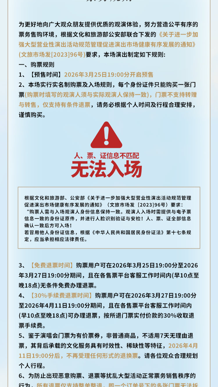 本项目4月7日19:00二次开售,二次售票的退票规则延用3月25日19:00预售时的退票规则,购票用户可在 2026 年4月7日19:00至4月11日19:00期间,且在各售票平台客服工作时间内(早10点至晚18点),可办理退票,但需按实付订单金额的30%收取退票手续费。