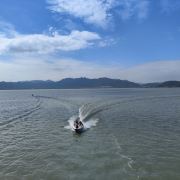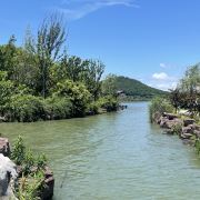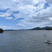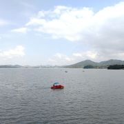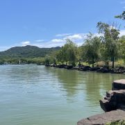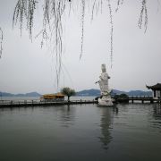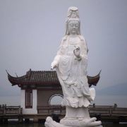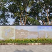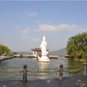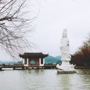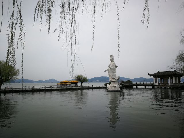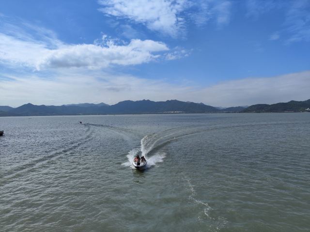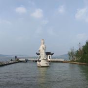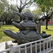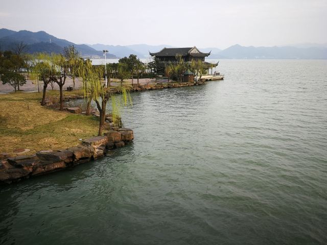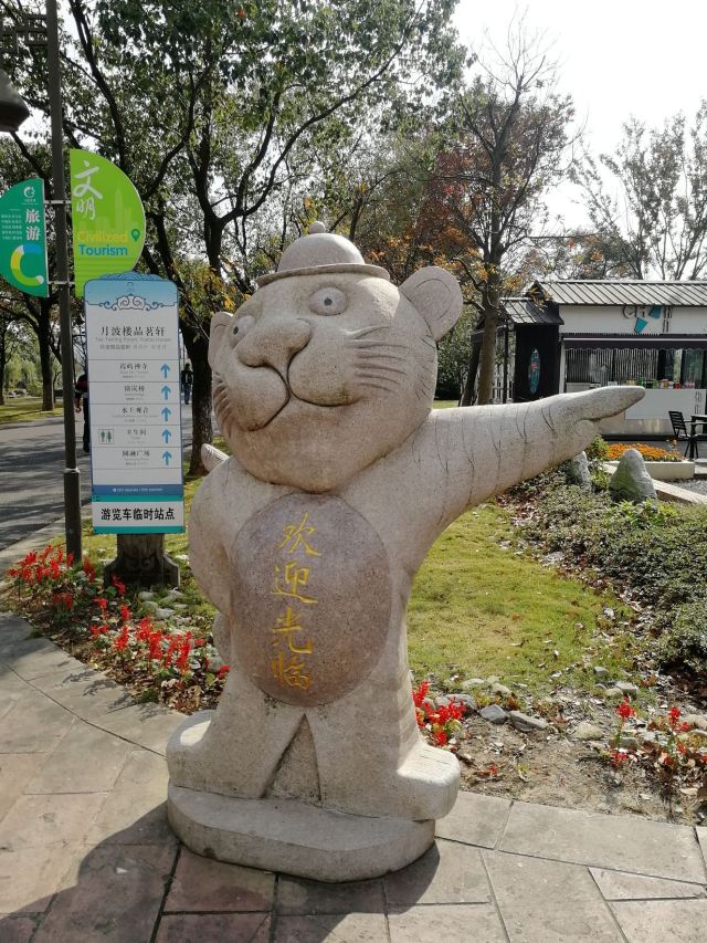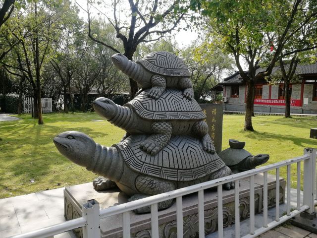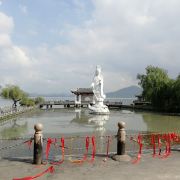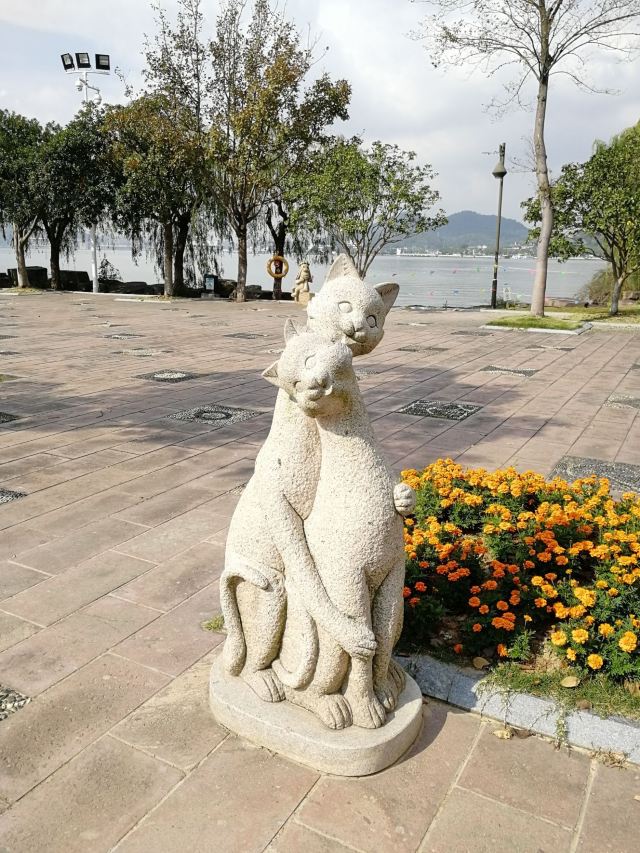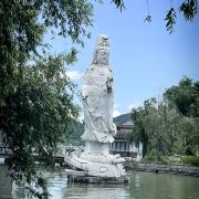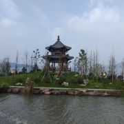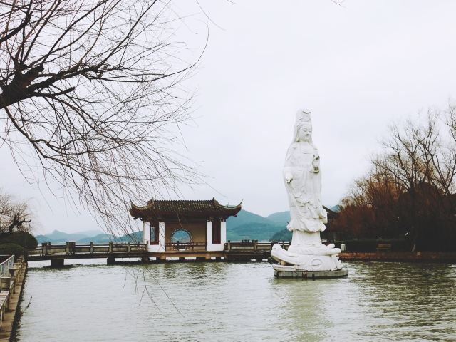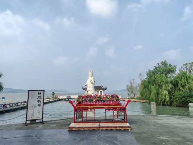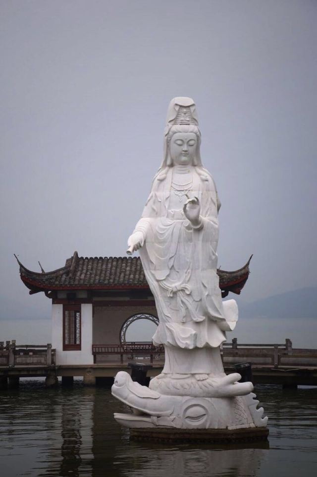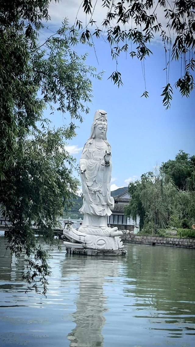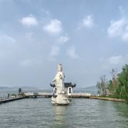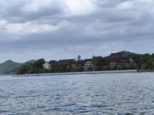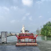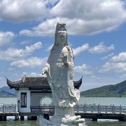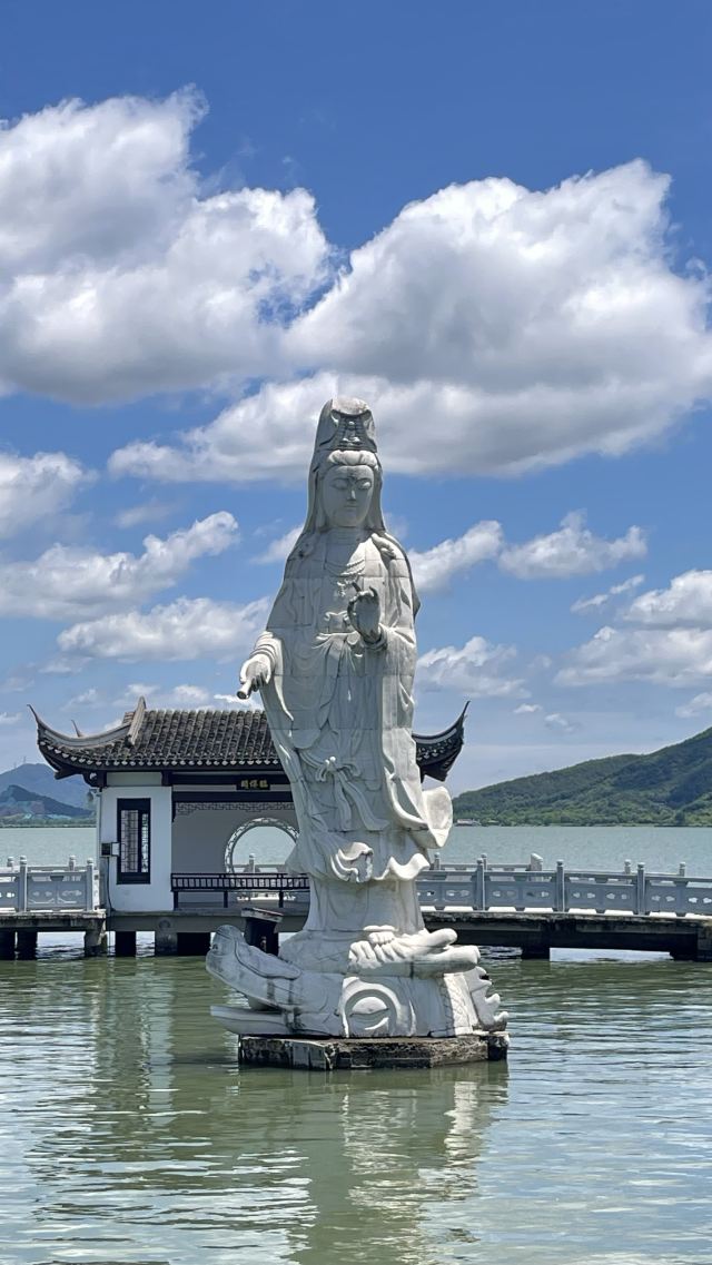 从霞屿禅寺出来继续往前,过一座桥后就到了圆融广场,因为《长江七号》在这里取过景,广场上有一些和电影相关的雕塑,很受小朋友喜欢。这里往左可去到彩弹射击中心、烧烤园和梨花岙,时间充裕可以去玩玩CS,走走林间小道。如果不打算继续往前,可选择在水上观音附近坐画舫返回景区大门,或者从堤上原路返回即可。