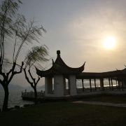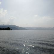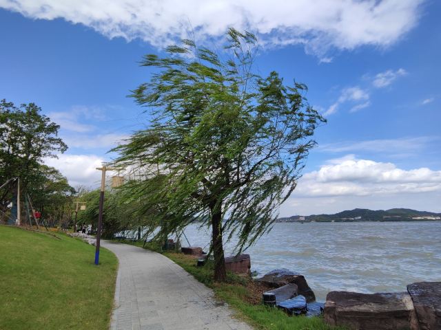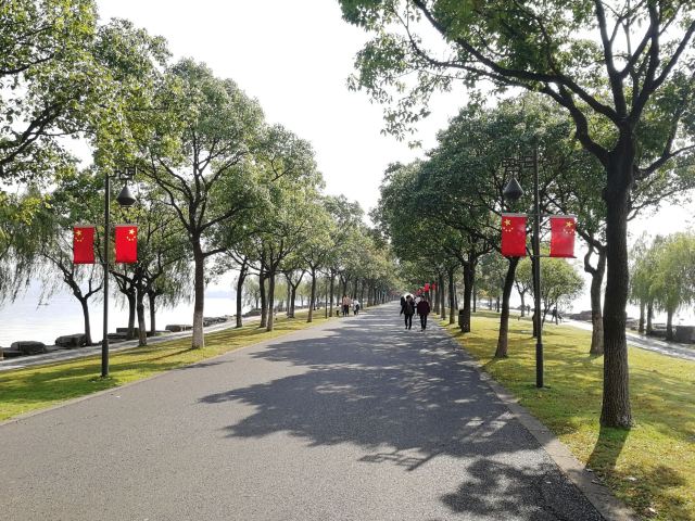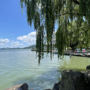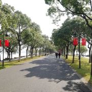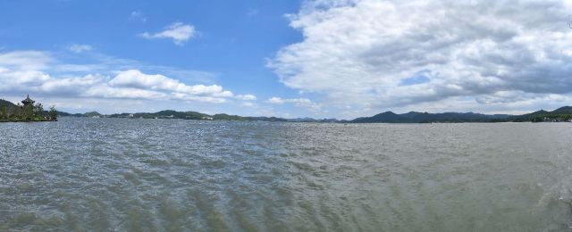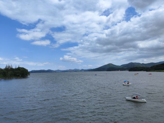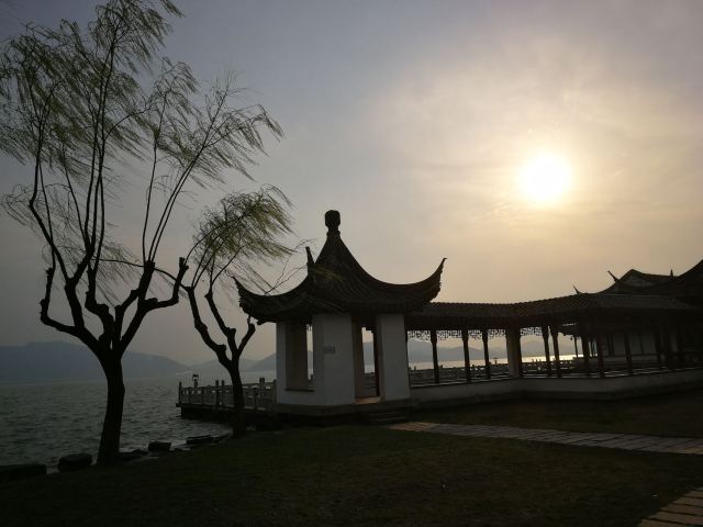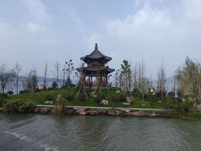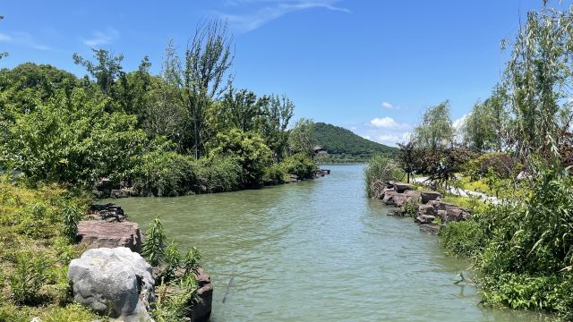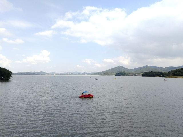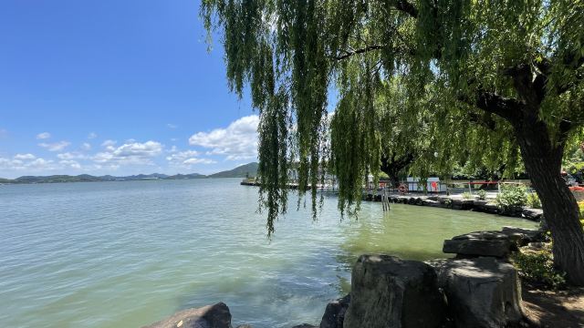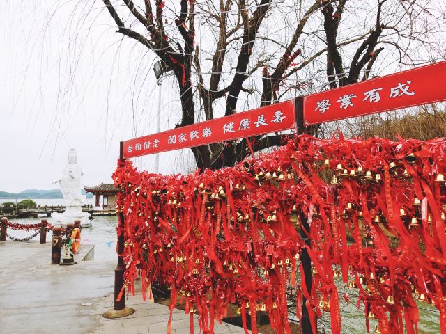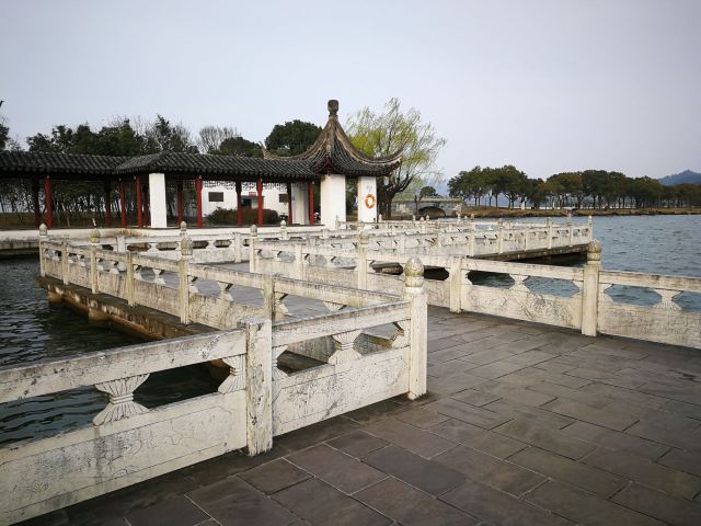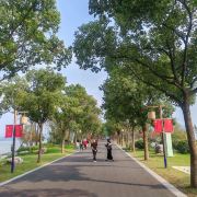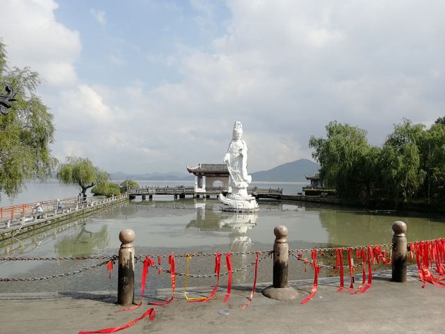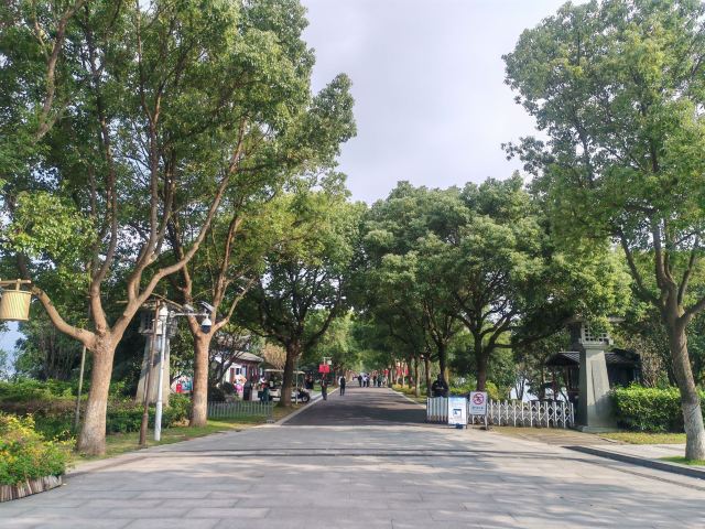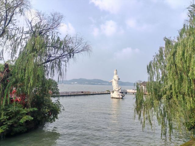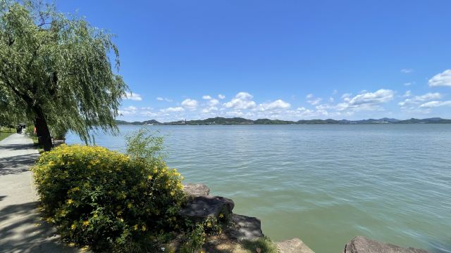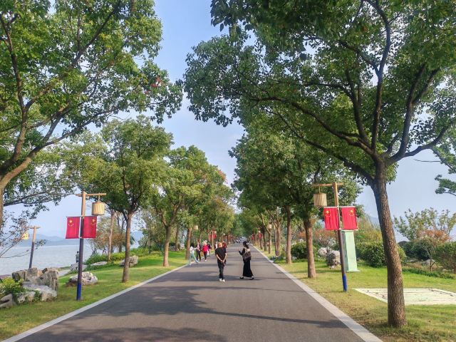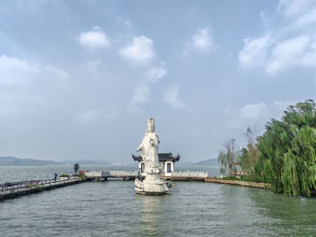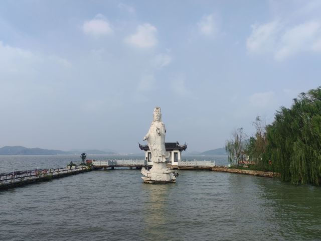 景区入口在陶公村附近,进入景区后,沿着长堤一路往里便可依次游览。堤上的路分为三条,中间的柏油路供观光车及自行车行驶,步行也可以,但需要注意安全;两旁各有一条花色卵石铺就的步道,三条路之间有灌木和花丛相隔。长堤沿岸是一排垂柳,夏天湖面上的风非常清凉,是避暑散步的好地方。景区门口可以坐电瓶车直达水上观音处,但沿着长堤走走的感觉也非常不错。