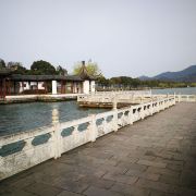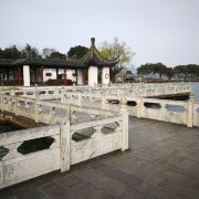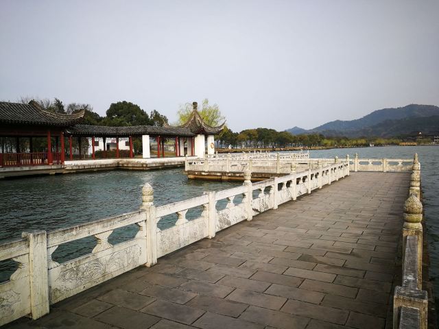 顺着长堤往前走,过影月桥后来到月波楼广场,可以在广场上的月波楼喝茶,旁边还有儿童游乐园,有滑梯、动物雕塑等等,地面上用卵石铺成各种图案,很是有趣。月波楼广场其实位于一个小岛上,走过一边的锁岚桥,左手边有一个小岛,叫松岛,形如松子,由小桥可到上面。由此继续前行不久,便到了小普陀景区的核心——霞屿。