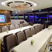 “汉雅8”简约大气,配有大型玻璃幕墙及穹顶,是一艘全通透无死角的现代前卫新型游船,游船内设有大型商务包间、多功能舞台能满足多样化活动需求,总客位200位。