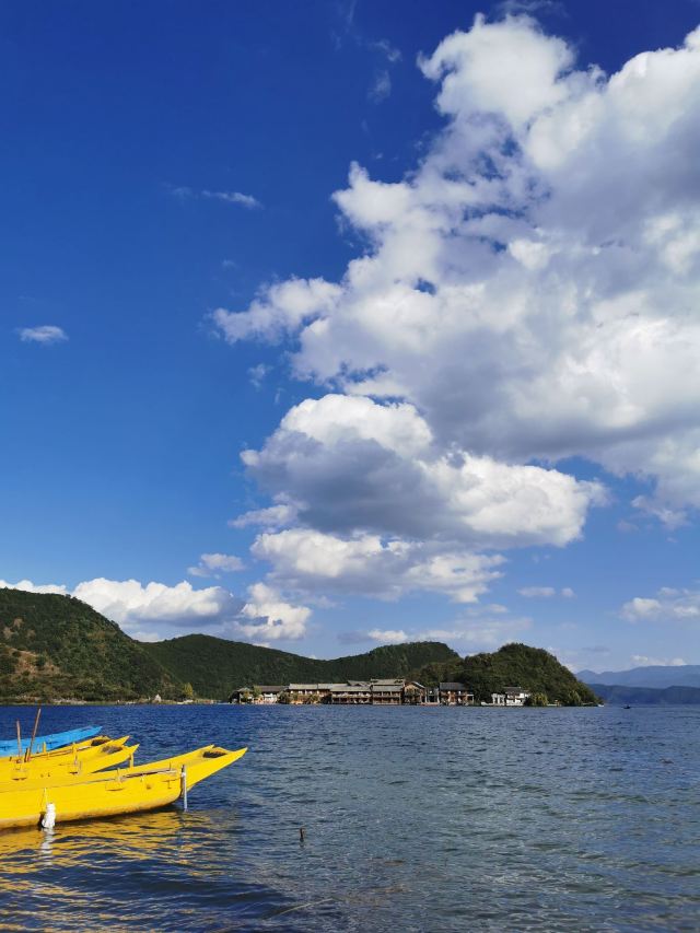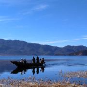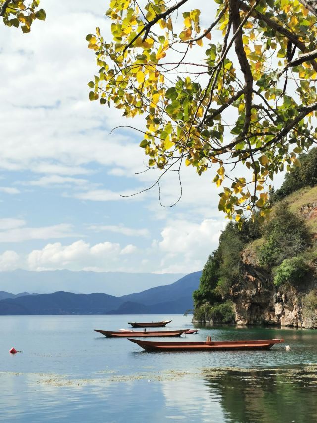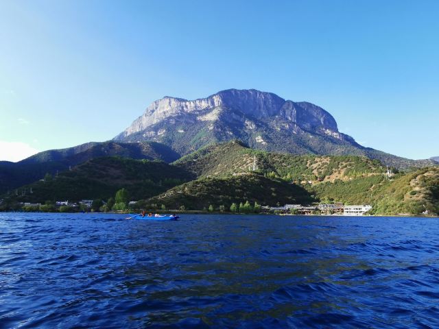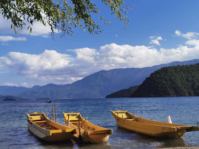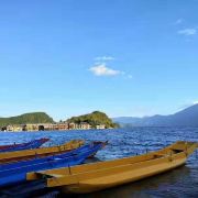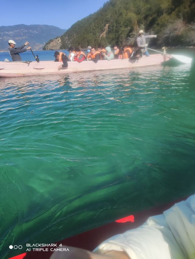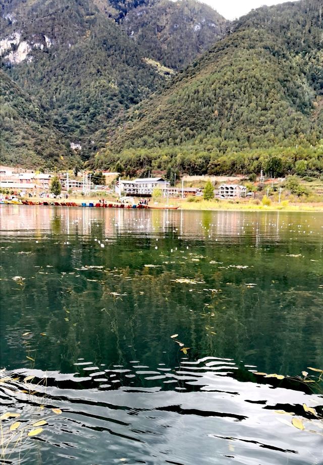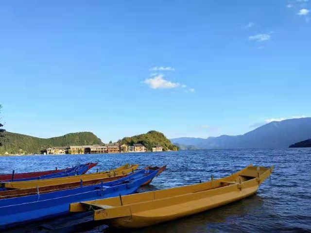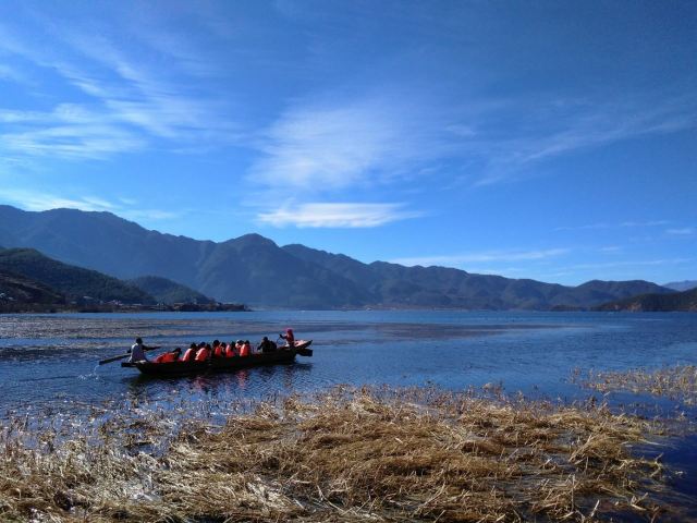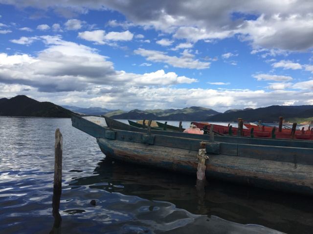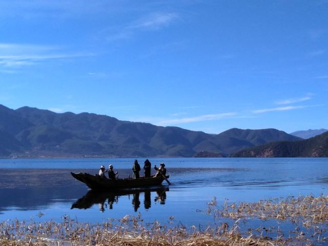 槽船由一根粗壮的镂空圆木,两头削尖制成,因其看起来像一只长长的槽而得名。泸沽湖湖水碧蓝清澈,藻花点缀其间,湖中的通工具是摩梭人特有的“槽船”。