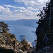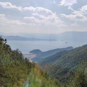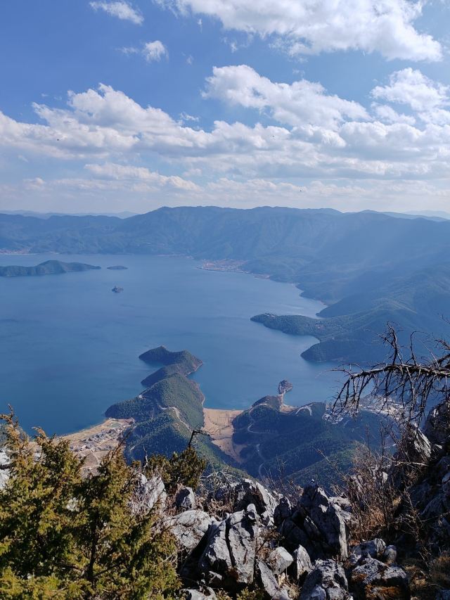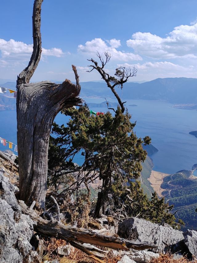游览格姆女神山,必须在山脚下乘坐登山索道,索道分为两段,首先是手刹的小车,高处才是一般的缆车。缆车好象是七八十年代的样子,没有保护外壳,就不停的360度旋转拍照。缆车上站距离女神洞,还要一些距离,需要爬很陡的楼梯,真的很陡。爬到顶上后,这里有个很大的玛尼堆,四周全都挂满了五彩斑斓的经幡,随风舞动着。经幡也叫“风马旗”,是印有藏传佛教经文的彩色布帛,当地摩梭人视为佛祖保佑的象征物。每当经幡被风吹过时,表示经幡上的经文来到了每个虔诚的摩梭人身边,意味着吉祥和好运。抵达最高的观景台,静态的俯瞰整片 泸沽湖 全貌。从山顶看向山下的 泸沽湖 ,静谧优雅, 天水 相接,云层相叠,夹杂平缓的山坡匍匐其中,让人倍感心旷神怡。