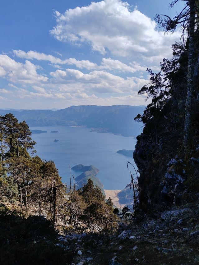 格姆女神 山南 高北低,灰白色调鲜明,同名主峰海拔高出湖面1000米左右,由于海拔很高,从清晨到上午,哪怕天气再好,都不时看到有云雾倒挂在陡峭的山壁上,加上“格姆女神”这个名字,平添一股神秘感。
