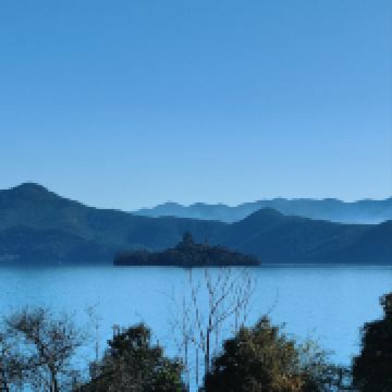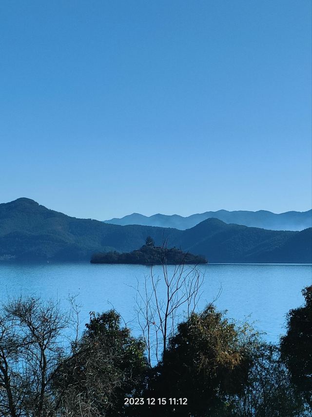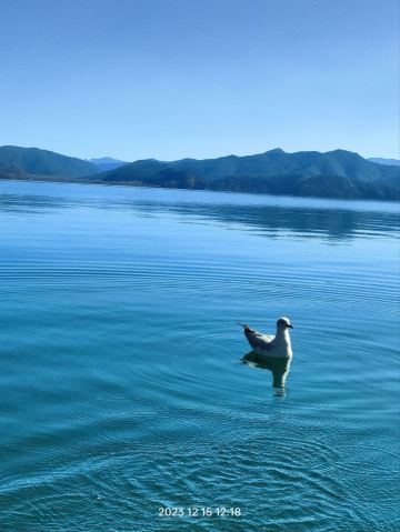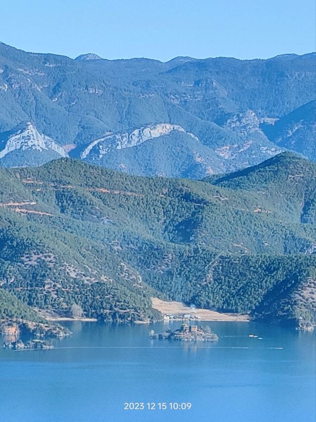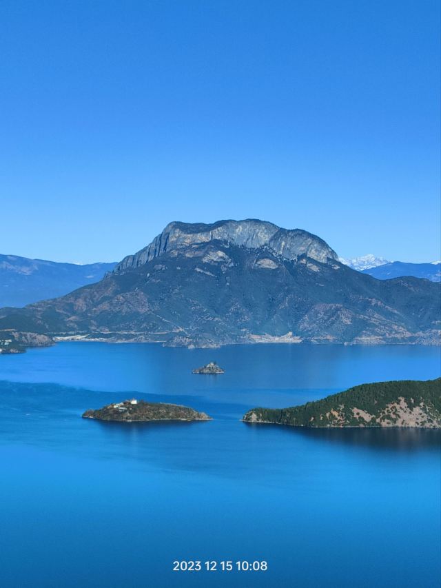 买好票之后,我就去泸沽湖观景台了,泸沽湖观景台位于泸沽湖南岸的宁泸公路旁,是观看、拍摄泸沽湖全景的最佳位置。这里视野非常开阔,整个湖面都尽收眼底,蔚蓝的湖水、湛蓝的天空,还有绿树环绕的湖岸、景色优美的里格半岛,一起构成一幅美妙的画卷。突然发现,怎么这个景色这么熟悉呢,美得让人陶醉。原来前期查攻略的时候,景区最为人熟知的官方宣传照片就是出自这里,难怪这里成为了摄影师们无比热爱的拍照天堂。被泸沽湖的美景美呆之后,赶紧拿出相机来拍照留恋。