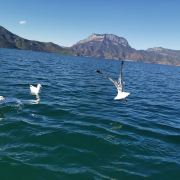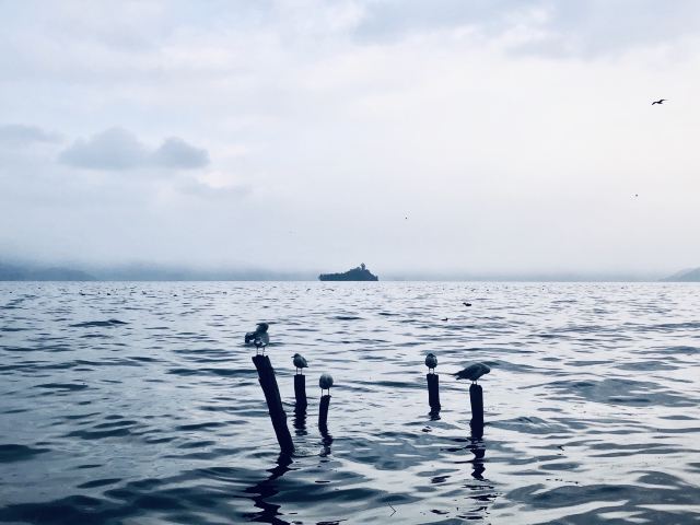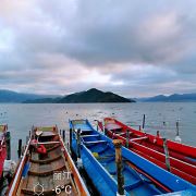 我是喜欢在这里观日出,期待着霞光铺湖面,感受那磅礴向上的壮观;可惜,薄云遮日,天上不见金光,湖面不见红绸,于是坐船等里务比岛;小船在率真的摩挲汉子用力摇桨下向小岛游去,精灵们纷纷相随,湛蓝的湖水泛着微波,终于将自己置身于这梦幻的湖水上 ,本想静静欣赏,可心花怒放无法平静。