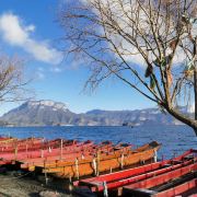 村中的服务设施比较完善,店铺齐全,尤其有很多卖明信片、卖特色纪念品的小店,都很小资,蛮有特色。在靠近湖边的地方有很多猪槽船,游客可以付费乘船游湖,还可以到湖上的两个小岛去。村里租自行车、租马的也有很多,来一次环湖骑行也一定非常惬意。