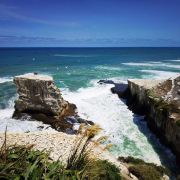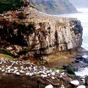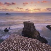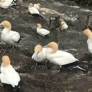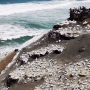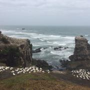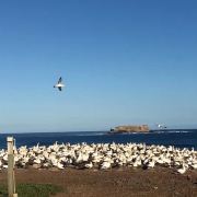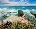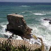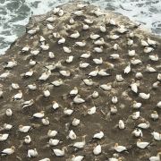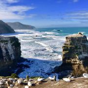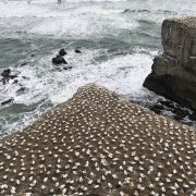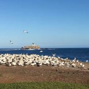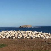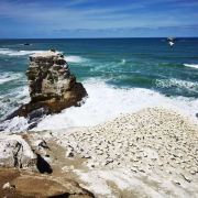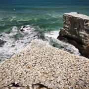鸟岛距离奥克兰中心区约一个小时的车程,占地十分广阔,一直延伸至海上的两个相互垂直的岛屿。停车场的附近有一条短程的步行道直接通往观景台,在那里可以更清楚的看到岛上的美景。每年从8月份开始,一直到次年的3月份,有大约1200对的塘鹅在这里筑巢,而各个巢之间距离只有几厘米,而塘鹅却能避开同类的尖嘴准确的停到自己的巢前,十分的精妙。塘鹅体重约2.5公斤,鸟翼约2米长,因此飞行时也很是壮观,让人印象十分深刻。