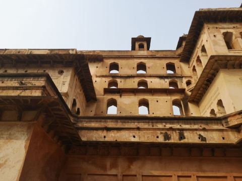 Jehangir Mahal古堡是欧查古堡中较为精巧壮观的一座宫殿。四面的建筑将中央围成一个庭院,正中是一座凹陷的喷泉。它有八个巨大的穹顶作为屋顶,每个墙角都有一个圆顶的小塔,顶楼中央还有凸进庭院的阳台,内部布局精妙复杂,人在其中穿行仿佛进入了迷宫,却又四通八达。从这里镂空的石头阳台上,可以很好的欣赏整个古镇的风景,很是惬意,每一个样式不同的镂空窗棂,也很有意境。